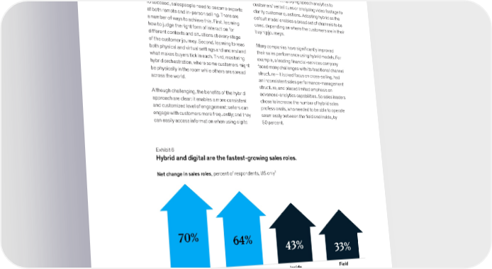 but a mix of the two, adjusting to customer need remote channels, while not losing the effectiveness at each stage of the sales process. And it seems of in-person meetings and demonstrations. this phenomenon is here to stay: research shows that hybrid has seen the fastest growth of all types The hybrid model also allows traditional in-person of roles over the last few years—making hybrid a sellers to use technology to optimize their sales channel of its own (Exhibit 6). activities, such as applying speech analytics to customers’ verbal cues or analyzing video footage to To succeed, salespeople need to become experts clarify customer questions. Adopting hybrid as the at both remote and in-person selling. There are default model enables a broad set of channels to be a number of ways to achieve this. First, learning used, depending on where the customers are in their how to judge the right form of interaction for buying journeys. different contexts and situations at every stage of the customer journey. Second, learning to read Many companies have significantly improved both physical and virtual settings and understand their sales performance using hybrid models. For what makes buyers tick in each. Third, mastering example, a leading financial-services company hybrid orchestration, where some customers might faced many challenges with its traditional channel be physically in the room while others are spread structure—it lacked focus on cross-selling, had across the world. an inconsistent sales performance-management structure, and placed limited emphasis on Although challenging, the benefits of the hybrid advanced-analytics capabilities. So sales leaders approach are clear: it enables a more consistent chose to increase the number of hybrid sales and customized level of engagement; sellers can professionals, who needed to be able to operate engage with customers more frequently; and they seamlessly between the field and inside, by can easily access information when using digital 50 percent. Exhibit 6 Hybrid and digital are the fastest-growing sales roles. Net change in sales roles, percent of respondents, „S only¹ 70% 64% 43% 33% Hybrid Digital Inside Field 1Q: over the past year, how has the size of your company's sales force in the following areas changed? Source: McKinsey ompany loal ulse, ov €1, n ‚ ƒ€ McKinsey & Company 16 Future of B2B sales: The big reframe