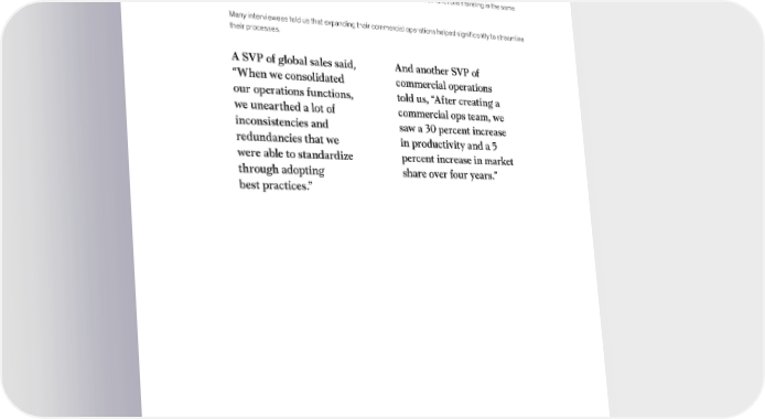 Commercial operations is an ideal partner for sales, because it has the power to observe and analyze markets, generate insights through data, and use these insights to steer the salesforce. But companies need to invest in it continually to ensure its success. Some organizations have transformed it into a trifecta of sales operations, marketing operations, and customer-success operations—to great effect. This critical change requires reconfiguring the team and organizational structure, but with it comes effective collaboration, the better dissemination of information, and all functions traveling in the same direction. Many interviewees told us that expanding their commercial operations helped significantly to streamline their processes. A SVP of global sales said, And another SVP of “When we consolidated commercial operations our operations functions, told us, “After creating a we unearthed a lot of commercial ops team, we inconsistencies and saw a 30 percent increase redundancies that we in productivity and a 5 were able to standardize percent increase in market through adopting share over four years.” best practices.” Future of B2B sales: The big reframe 25