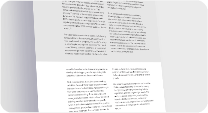 Diversity and inclusion: An imperative for sales The sales function—at least in the US—has been our objectives and key results, into the way that our slow when it comes to increasing gender and racial executives talk about the business, into our core diversity. In 2019, 76 percent of salespeople in operating principles, and into our reviews. How are the United States were white, and the number has you serving the customer and the user? Part of that barely changed in the last decade. Women account has to be that I’m serving everyone, not just the for less than one-third of all B2B sales roles, falling people that look like me.” to just a quarter in the technology sector. The higher up the organization, the fewer women there Some companies have been successful here. are: only 12 percent of the top sales jobs are held A leading business-information services firm, by women. Yet research suggests that women in where more than 40 percent of the salesforce B2B sales outperform men—86 percent of women are women (a proportion that carries through to regularly achieved quota compared to 78 percent of higher management roles), has taken steps to make men, according to a 2020 Harvard Business Review the organization more diverse by encouraging 10 report. employee referrals for hires. And the head of sales at a professional-services company told us that its The sales leaders we spoke to believe that diversity leadership walks the talk: all six of the senior-level is needed and is desirable, though admit that it is appointments made over the last 12 months are very much a work in progress. The head of strategy from diverse backgrounds. The company has also at a leading technology firm expressed the view of created diverse interviewer panels to overcome many: “Having a diverse salesforce is necessary if biases in interviews—and has included diversity as a we are serving diverse customers … [The value of metric in its quarterly reviews. diversity] has been embedded into the culture, into consultative sales model, the company needed to training on these skills, improved its coaching develop a training program for reps. Using data program, and set up a long-term training structure analytics, it discovered three crucial issues. that made capability building a key enabler of sales growth. First, reps spent too much time on non-selling activities. Second, there was a large disconnect Our research shows that companies can boost the between how effectively sales managers thought lifetime value of sellers by 10 percent by making they were coaching reps, and how the reps the right hires, optimizing onboarding, building perceived the coaching. Third, sales reps and capabilities, and retaining the right people. The managers believed that relationship and network analytics underpin this: using psychometrics, building were key skills for customer growth, behavioral data, performance, and team or when in fact sales analytics showed that pipeline relational analytics, organizations can build targeted management, prospecting, and product knowledge interventions at every stage of a salesperson’s were more important. The company focused its tenure. 10 Andris A. Zoltners et al., “Why women are the future of B2B sales,” Harvard Business Review, May 28, 2020. Future of B2B sales: The big reframe 29