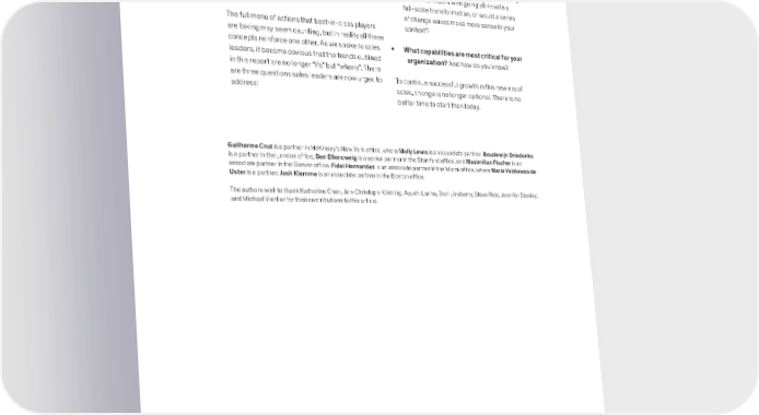 Sales has changed more in the past two years than • Which topics do you want to prioritize? Where in the previous decade—and is unlikely to slow are you already ahead, and which issues will down. Customers expect a tailored rather than a affect your business the most? generic answer, channel silos are moving to hybrid, analytics is at the heart of all GTM discussions, and • How quickly do you want to embrace change? companies have to rethink how to obtain and retain Are you confident with going all-in with a skilled salespeople. full-scale transformation, or would a series of change waves make more sense in your The full menu of actions that best-in-class players context? are taking may seem daunting, but in reality all these concepts reinforce one other. As we spoke to sales • What capabilities are most critical for your leaders, it became obvious that the trends outlined organization? And how do you know? in this report are no longer “ifs” but “whens”. There are three questions sales leaders are now urged to To continue successful growth in this new era of address: sales, change is no longer optional. There is no better time to start than today. Guilherme Cruz is a partner in McKinsey’s New York office, where Molly Lewis is an associate partner. Boudewijn Driedonks is a partner in the London office, Ben Ellencweig is a senior partner in the Stamford office, and Maximilian Fischer is an associate partner in the Denver office. Fidel Hernandez is an associate partner in the Miami office, where Maria Valdivieso de Uster is a partner; Josh Klemme is an associate partner in the Boston office. The authors wish to thank Katherine Chan, Jan-Christoph Köstring, Ayushi Ladha, Bret Lineberry, Steve Reis, Jennifer Stanley, and Michael Viertler for their contributions to this article. 36 Future of B2B sales: The big reframe