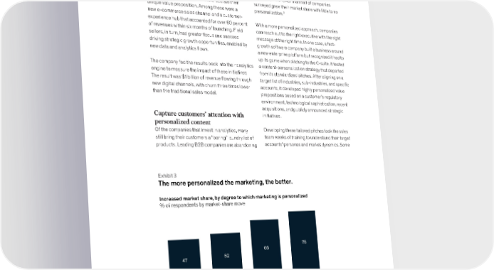 Using internal data, external interviews, and focus this one-size-fits-all approach and taking a page groups, they systematically defined customer out of the B2C playbook. Only 8 percent of B2B segments, journeys, and buying preferences. They organizations are currently set up to deliver highly hosted design-thinking workshops where they personalized marketing—but of that 8 percent, translated these insights into a comprehensive list three-quarters report growing market share of sales initiatives and campaigns meant to drive (Exhibit 3). And fewer than half of companies specific business outcomes and articulate their surveyed grew their market share with little to no unique value proposition. Among these were a personalization.3 new e-commerce sales channel and a customer- experience hub that accounted for over 60 percent With a more personalized approach, companies of revenues within six months of launching. Field can reach out to the right executive with the right sellers, in turn, had greater focus and success message at the right time. In one case, a fast- driving strategic growth opportunities, enabled by growth software company built a business around new data and analytics flows. a new enterprise platform but recognized it had to up its game when pitching to the C-suite. It tested The company fed the results back into their analytics a content-personalization strategy that departed engine to measure the impact of these initiatives; from its standardized pitches. After aligning on a The result was $1 billion of revenue flowing through target list of industries, sub-industries, and specific new digital channels, with churn three times lower accounts, it developed highly personalized value than the traditional sales model. propositions based on a customer’s regulatory environment, technological sophistication, recent acquisitions, and publicly announced strategic Capture customers’ attention with initiatives. personalized content Of the companies that invest in analytics, many Developing these tailored pitches took the sales still bring their customers a “boring” laundry list of team weeks of training to understand their target products. Leading B2B companies are abandoning accounts’ personas and market dynamics. Some Exhibit 3 The more personalized the marketing, the better. Increased market share, by degree to which marketing is personalized % of respondents by market-share move 66 75 47 52 Somewhat Personalized Very Direct one-on-one McKinsey & Company 3 Auron Arora, Liz Harrison, Candace Lun Plotkin, Max Magni, and Jennifer Stanley, “The new B2B growth equation,” McKinsey, February 23, 2022. 10 Future of B2B sales: The big reframe
