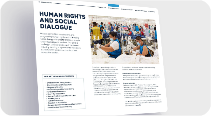 19 2021 ESG REPORT THE BIG PICTURE EMPOWERING WOMEN ENABLING OPPORTUNITY ENRICHING COMMUNITIES GOVERNANCE HUMAN RIGHTS AND SOCIAL DIALOGUE We are committed to upholding and progressing human rights and cultivating social dialogue to create a resilient supply chain that respects workers. Our goal is to design, collaborate on, and implement industry-leading programs that transform outcomes for workers and enterprises across the sector. Our holistic approach begins with our To uphold these policies and improve supply chain working Human Rights Policy and Code of Vendor conditions, we focus on two areas: Conduct (COVC). Both are based on internationally accepted labor standards Assessment and Remediation OUR KEY HUMAN RIGHTS ISSUES and guidance, including the Universal Through transparency and partnership across our supply chain, Declaration of Human Rights (UDHR), we can improve workers’ well-being, protect human rights, reduce UN Guiding Principles on Business and environmental impacts, and improve business performance. > Child Labor and Young Workers Human Rights, UNGC, Organisation for > Discrimination and Harassment Economic Co-operation and Development Capability Building > Wages and Benefits (OECD) Guidelines for Multinational In partnership with ILO-IFC Better Work, suppliers, NGOs, > Fire, Building and Electrical Safety Enterprises, and the International Labour and others, we have established programs to improve worker > Grievance Mechanisms Organization’s (ILO) Core Conventions. representation and leadership involvement. These cover > Short-Term Contracts Our policies also account for local labor issues such as workplace cooperation, supervisory skills, > Human Trafficking and Forced Labor laws in each country where we do business. and empowering women. We also support our facilities with > Working Hours environmental capability-building programs, which can be found > Humane Treatment in the Resource Efficiency and Manufacturing section (p. 37). > Freedom of Association > Foreign Contract Workers and Recruitment Detailed information on our human rights policies, management > Unauthorized Subcontracting approach, and resolution actions for our key human rights issues is available on our website.