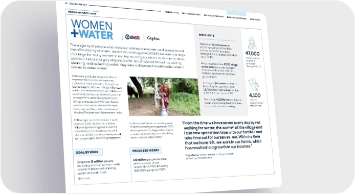 36 2021 ESG REPORT THE BIG PICTURE EMPOWERING WOMEN ENABLING OPPORTUNITY ENRICHING COMMUNITIES GOVERNANCE PROGRAM SPOTLIGHT HIGHLIGHTS More than 47,000 women in cotton-growing communities The majority of people who make our clothes are women, and access to and trained on WASH practices 47,000 the affordability of water, sanitation, and hygiene (WASH) services is a major through P.A.C.E. in 2021 (162,000+ women trained since 2017) on WASH challenge for many women in our key sourcing countries. As women in those practices communities are largely responsible for household duties such as cooking, Prepared more than 2,100 village through P.A.C.E. cleaning, and collecting water, they bear a disproportionate burden when it action plans for water access in comes to water stress. India in collaboration with the national government and local governments We have a particular focus on India, an important location for both growing Catalyzed $6.1 million in WASH cotton and making textiles. Through the financing through more than USAID Gap Inc. Women + Water Alliance, a 31,700 micro-loans ($12.7 million public-private partnership, we collaborate in 66,100 loans since 2017) 4,100 with CARE, Water.org, WaterAid, and the Institute for Sustainable Communities More than 4,100 farmers adopted farmers to improve access to WASH services for water-stewardship best practices adopted water women in the water-stressed Ganges, as a result of water training stewardship Godavari, and Narmada river basins in Madhya Pradesh and Maharashtra, India. Following a six-month pause in work due to COVID-19, Women + Water build out the Gap Inc. community water “ From the time we have saved every day by not Alliance partners agreed to extend resilience strategy to support our 2050 walking for water, the women of the village and the initiative for an extra year, until water goals of creating positive impact January 2023. Looking ahead, we will in water-stressed regions and building I can now spend that time with our families and be using insights from this program to water-resilient value chains. take time out for ourselves, too. With the time that we have left, we work in our farms, which GOAL BY 2023 PROGRESS IN 2021 has resulted in a growth in our incomes.” Empower 2 million people - 1.5 million people reached Pooja Doriya, cotton-grower in Jamgod village in Madhya Pradesh, India including 1 million women - with with improved water access to improved drinking access since 2017, including water and sanitation 938,000+ people in 2021 On track