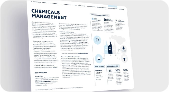 38 2021 ESG REPORT THE BIG PICTURE EMPOWERING WOMEN ENABLING OPPORTUNITY ENRICHING COMMUNITIES GOVERNANCE CHEMICALS HOW WE MANAGE CHEMICALS 1 INPUT 2 PROCESS 3 OUTPUT MANAGEMENT MANAGEMENT MANAGEMENT MANAGEMENT The selection of Adherence The outputs of better chemical to chemical apparel and footwear The retail industry is a contributor to In addition to continuing to drive implementation of the inputs and starting management best manufacturing global industrial water pollution. To reduce ZDHC MRSL and ZDHC Wastewater Guidelines, we laid materials is essential practices during include finished to reducing the use manufacturing is products and environmental impact and improve access the groundwork to increase training and capability- and discharge of critical for reducing wastewater. to clean, safe water, we aim to eliminate building opportunities for our suppliers. hazardous chemicals. both human and the discharge of hazardous chemicals environmental risks. within our supply chain. We also recognize Chemicals and Circularity the importance of safely managing and To support our circularity efforts in 2020 we joined a handling chemicals, and of identifying and study convened by Inter IKEA and H&M Group to improve scaling the use of inherently safe chemicals understanding of the chemical content of recycled textile in manufacturing. materials. We and other participating brands collected samples of post-consumer recycled fibers and tested We expect our suppliers to comply them for chemicals on the AFIRM Group RSL. The study with industry guidelines including the organizers communicated high-level findings in October Apparel and Footwear International RSL 2021. More research and work is needed to understand Management (AFIRM) Group Restricted the role of chemicals in a circular economy, but this Substances List (RSL), the ZDHC study illustrated how industry collaboration can Manufacturing Restricted Substances contribute to solutions. List (MRSL), and the ZDHC Wastewater Guidelines. Additionally, we expect priority Learn more about the study on Sustainable Brands. 16 suppliers to complete the Higg Index 1. 2. 3. 3.0 Facility Environmental Module, which, Elimination of PFC-Based Finishes among other aspects of environmental We are working to phase out chemicals of particular management, evaluates chemical inventory, concern and are on track to eliminate all PFC-based usage data and management practices. finishes from our supply chain by 2023. Our Brand R&D, Product Quality, and Mill Management teams set a Find more about our approach to baseline of fabrics with PFC-based finishes that needed chemicals management on our website. to be converted to a non-PFC-based finish or retired GOAL BY 2023 PROGRESS BY 2021 from use. These teams worked cross-functionally to define best practices, create internal procedures for ELIMINATE 2021 PROGRESS fabric conversion, and connect with chemical suppliers PFC-based <2% 38% 92% for technical support. We also maintain an internal list finishes of fabrics used of products Gap Inc. Supply Chain of acceptable non-PFC-based finishes, which we share from our across our with water- or fabrics with For more than 15 years, we have required with our suppliers. supply chain brands had stain-repellent a PFC-based our denim laundries to participate in our potentially finishes were finish were Water Quality Program, which allows On track PFC-based made using successfully us to actively monitor and improve finishes. non-PFC converted wastewater quality. based finishes or exited. compared to 7% in 2020. 16. “Priority suppliers” are all Tier 1 suppliers as well as fabric suppliers comprising at least 70 percent of fabric production.