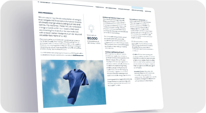 40 2021 ESG REPORT THE BIG PICTURE EMPOWERING WOMEN ENABLING OPPORTUNITY ENRICHING COMMUNITIES GOVERNANCE 2021 PROGRESS Addressing Emissions: Scope 1 and 2 Apparel Impact Institute (Aii): Our Retail stores generate approximately partnership with Aii and its predecessor We are exploring climate adaptation strategies 85 percent of Gap Inc.’s direct (Scope 1 (Clean By Design) has resulted in an that mitigate the financial and physical impacts and 2) GHG emissions and are the focus emissions reduction of 56,368 metric of climate change while building business and of our operational energy program. We tons of carbon dioxide equivalents, community resilience. These include renewable continue to invest in energy-efficiency helping support our Scope 3 SBTs. programs, and have rated all stores to In 2020, Gap Inc. joined Aii’s new Carbon energy projects within our supply chain and prioritize retrofit projects and established Leadership Program, through which five accelerating the transition to raw materials protocols for new buildings. of our facilities have completed a pilot with a lower carbon footprint, such as recycled Generated over to understand their emissions reduction polyester (see more on p. 42). Our renewable energy projects, power targets and plans. 80,000 purchase agreements, and onsite The ongoing effects of COVID-19 have slowed progress on installations generated over 80,000 We also work with Aii, IDH (The megawatt hours of megawatt hours of clean energy in 2020. Sustainable Trade Initiative), and CEIA our Scope 3 supply chain energy-efficiency programs, as clean energy in 2020. These projects make us one of the largest (Clean Energy Investment Accelerator) we paused them to reduce the cost burden to our suppliers. purchasers of clean energy in the U.S. alongside other brands to identify However, our ongoing partnerships are driving meaningful retail industry. rooftop solar opportunities for facilities reductions across our Asia-based Tier 1 and Tier 2 facilities and identifying future areas of action. in Vietnam Addressing Emissions: Scope 3 Our 2021 GHG data and progress toward our 2030 goals will be The majority of our climate impacts cKinetics: We have been working with available later this year and shared on our website (ESG Resources). lie within our supply chain emissions, cKinetics to identify top mills and vendors which are directly tied to our production. to get clarity on their emissions reduction We work closely with our Product targets and strategies. We aim to collect Development teams and suppliers to more accurate facility-level data so that address material and facility emissions. we can create more robust strategies to In addition to implementing energy- help our suppliers set SBTs and support efficiency programming across our our own goals. supplier base, we are also engaging our strategic suppliers to commit to Schneider Electric: We worked with emissions reduction strategies and Schneider Electric in 2021 to conduct explore renewable energy opportunities. renewable energy opportunity assessments in key supply chain markets A strong part of our approach to reducing to identify strategies for collaboration Scope 3 emissions is partnerships with with our vendors in those regions. industry organizations that work in our key supplier markets: