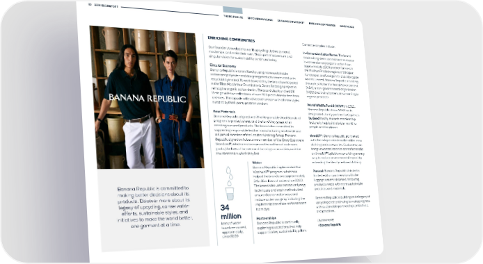 10 2021 ESG REPORT THE BIG PICTURE EMPOWERING WOMEN ENABLING OPPORTUNITY ENRICHING COMMUNITIES GOVERNANCE ENRICHING COMMUNITIES Current examples include: Our founders traveled the world upcycling clothes to mend, In -Conversion Cotton Farms: The brand modernize, and make their own. That spirit of adventure and made a long-term commitment to source singular vision for sustainability continues today. in-conversion and organic cotton from approximately 1,500 partner farmers in Circular Economy the Madhya Pradesh regions of Alirajpur, Banana Republic is committed to using more sustainable Kundanpur, and Udaigarh (India). Alongside cotton and polyester and designing products constructed with Arvind Limited, Banana Republic is funding recyclability in mind. To work toward this, the brand participated the work of Action for Social Advancement in the Ellen MacArthur Foundation’s Jeans Redesign project to (ASA), a non-governmental organization reimagine organic cotton denim. The brand also launched BR (NGO) that trains farmers on converting to Vintage with two collections of over 200 pieces handpicked from organic practices. archives. The capsule will evolve each season with all-new styles curated by third-party partner vendors. World Wildlife Fund® (WWF): In 2021, Banana Republic chose WWF as its Raw Materials designated charity partner for Gap Inc.’s Banana Republic aligned with The Responsible Wool Standard Do Good loyalty rewards membership program to protect sheep and the land they graze when feature to help build a better world for creating our wool products. The brand also committed to people and the planet. supporting responsible leather manufacturing worldwide and ® is a proud member of the Leather Working Group. Banana thredUP : Banana Republic partnered Republic signed on to become a member of the Good Cashmere with the independent reseller of like-new ® clothing and accessories. Customers can Standard , which aims to improve the welfare of cashmere goats, the lives of farmers and farming communities, and the bring unwanted items to stores for resale environment in which they live. on thredUP®’s platform, providing an easy way to reduce environmental impact by Water extending the life of pre-loved clothing. Banana Republic implemented the Washwell™ program, which has Paravel: Banana Republic debuted a helped the brand save approximately limited edition partnership with the 34 million liters of water since 2020. luggage essentials brand, featuring Banana Republic is committed to The brand also uses conscious dyeing products made with more sustainable making better decisions about its techniques and wash methods that practices and materials. products. Discover more about its ensure cleaner waterways and reduce water usage by including the Banana Republic is building on its legacy of legacy of upcycling, conservation 34 implementation of bio-softeners and upcycling and continuing to make progress efforts, sustainable styles, and foam dye. with sustainable partnerships, initiatives, initiatives to make the world better, million and practices. one garment at a time. Partnerships liters of water Banana Republic is continually LEARN MORE have been saved, exploring associations that help > Banana Republic approximately, support its key sustainability pillars. since 2020