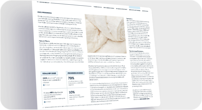 43 2021 ESG REPORT THE BIG PICTURE EMPOWERING WOMEN ENABLING OPPORTUNITY ENRICHING COMMUNITIES GOVERNANCE 2021 PROGRESS Synthetics All our brands have committed to increasing To help streamline industry approaches and expand best practices in their sourcing of recycled polyester to at raw materials sourcing, Textile Exchange made a beta version of the least 45 percent of polyester used by 2025, Preferred Fiber and Material Matrix (based on the Gap Inc. Preferred with some brands, such as Old Navy, setting Fiber Toolkit, which we donated to Textile Exchange in 2020). an even higher target. We are also an active member of Textile Exchange’s rPET Round We also piloted the SAC’s Higg Product Environmental Module to Table and Biosynthetics Working Group, understand the impacts of selected products and sought to create which help drive industry innovation on robust estimates of environmental impacts where possible. As well more sustainable fibers. We are especially as this, we developed an internal calculator for all our brands that interested in advancing opportunities uses MSI data to provide a more holistic picture of a raw material’s around lower-impact nylon and elastane, climate and water impact for baselining and goal tracking. two critical performance fibers with few existing alternative options. As R&D evolves Natural Fibers on microfiber and microplastics shedding To achieve our goals, we take a portfolio approach to sourcing in garments, we will incorporate the latest materials in order to scale multiple options and develop fiber insights into our preferred fiber strategies. security. In addition, we work with industry partners to increase the traceability of the sustainable cotton options available to our Manufactured Cellulosics brands. For example, the Hong Kong Research Institute of Textiles We have worked closely with our fiber and Apparel Limited (HKRITA) is studying the desired hydroponic suppliers to eliminate production that farming conditions for growing extra long staple (ELS) cotton in Award at the 2022 International Exhibition of Inventions of Geneva, uses wood-derived fibers from ancient, an urban environment to enable a consistent, stable, transparent which recognizes inventions and research around the world under endangered, high conservation value, and supply of cotton in an urban environment, supporting our goals the patronage of the World Intellectual Property Organization high carbon stock forests. We continue for fiber security and traceability. This 2021 project won the Silver (WIPO), the Swiss Government, and the City of Geneva. to work with the CanopyStyle initiative to encourage global suppliers to set policies We were the first brand to sign up to the new U.S. Cotton Trust and complete audits to guarantee they are Protocol (USCTP), in 2020, and are now leading a pilot to deploy not sourcing from ancient and endangered USCTP’s platform for tracing products with U.S.-grown cotton forests in their production. We are GOALS BY 2025 PROGRESS IN 2021 through the supply chain. In partnership with technology provider also partnering with Canopy on next- TextileGenesis™, we successfully traced over 140,000 garments generation fiber sourcing, which prioritizes and will expand on this pilot in 2022. We also joined nine other alternative inputs such as recycled 17 100% of cotton sourced 79% brands on a panel dedicated to advancing traceability with textiles and waste materials. Our aim is to from more sustainable Better Cotton. consolidate our business to only work with sources of cotton was sourced suppliers that receive Canopy’s highest from more sustainable On track sources Our brands are leading the way on natural fibers. Gap has set an “green shirt” ranking, which indicates they ambitious new 2030 goal to source 100% regenerative, organic, meet the criteria for best practices in in conversion to organic, or recycled cotton and Banana Republic protecting forests. At least 45% of polyester has partnered with Arvind Limited in a multi-year investment to sourced from recycled 10% support a farm in India that is transitioning to growing certified We will continue to explore ways to sources (rPET). of polyester was organic cotton. In 2021, Banana Republic also joined the Good develop definitions and a validated ® sourced from recycled Cashmere Standard and Leather Working Group to source approach to adopting regenerative Some Gap Inc. brands have higher goals. sources responsible animal-derived materials. In addition, Banana agriculture and alternatives to fossil On track Republic also partners with the Responsible Wool Standard, while fuel-derived raw materials. Find out Athleta uses the Responsible Down Standard. more in our 2021 SASB Index. 17. Defined as: Better Cotton (formerly BCI), verified U.S.-grown cotton (USCTP), organic, in conversion (to verified organic), recycled, and regenerative.