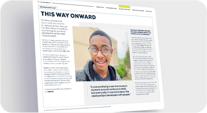 27 2021 ESG REPORT THE BIG PICTURE EMPOWERING WOMEN ENABLING OPPORTUNITY ENRICHING COMMUNITIES GOVERNANCE PROGRAM SPOTLIGHT THIS WAY ONWARD Old Navy believes that opportunity should be for all, not just the few. Through THIS WAY ONWARD TEACHES This Way ONward, Old Navy RICHARD GREENE ABOUT THE is continuing its journey to POWER OF RELATIONSHIPS become the world’s most A self-described optimist, high school inclusive brand. senior Richard Greene felt discouraged after being rejected for job after job. Old Navy has been expanding This Way He was applying for work so he could ONward since 2007 to create the next save money for college. The director generation of leaders. Through a growing of the Boys & Girls Club he attended network of partners, including Boys & encouraged him to apply for This Way Girls Clubs of America, the program ONward, and with support from his tackles systemic barriers to employment. parents, he was successful. This Way ONward provides young When Richard started work at Old people aged between 16 and 24 with Navy, he found himself surrounded by structured training and valuable a supportive team, including his store first-job experience. The program also leader, a job coach, and a “Big Sib” develops mentors’ leadership skills. coworker. Richard was in his element and enjoyed interacting with customers Research confirms that the program and sharpening his leadership skills. His works. Alumni stay with the company worries about college, and life began to twice as long as their peers, and store drop away. “Having a job you enjoy keeps managers say This Way ONward hires you present,” he said. “It helped me leave are top performers. Our latest evaluation the stress of the world behind. This Way 10 survey revealed that new hires also feel ONward really taught me not to look at a a sense of belonging at Old Navy, feel job as a job, but as an opportunity.” supported by their managers, and are excited about their work. Richard also began to see that the real “ It was satisfying to see the money in impact of work wasn’t the paycheck Find more about This Way ONward on but the people. “It was satisfying to see our website. my bank account continue to climb, the money in my bank account continue but eventually, it was more about the to climb,” he said, “but eventually, it relationships I developed with people.” was more about the relationships I developed with people.” 10. We have moved to a biennial cadence for the evaluation survey due to consistently positive results. The next evaluation is planned for 2022.