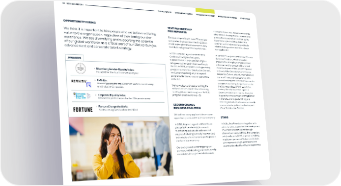 30 2021 ESG REPORT THE BIG PICTURE EMPOWERING WOMEN ENABLING OPPORTUNITY ENRICHING COMMUNITIES GOVERNANCE OPPORTUNITY HIRING TENT PARTNERSHIP assessment process. These assessments FOR REFUGEES allow candidates to provide evidence that We think it is important to hire people who we believe will bring a conviction is not related to their ability value to the organization, regardless of their background or Tent is a nonprofit with over 170 member to perform a job and let us determine experience. We see diversifying and supporting the potential companies that was launched in 2016 to whether a criminal record is specifically of our global workforce as a critical part of our 21st century job mobilize the global business community related to the position that a candidate to include refugees in their workforces. has applied for. advancement and corporate talent strategy. In 2021, Gap Inc. signed on to the Tent In April 2021, we joined the Second Chance Coalition for Afghan Refugees, Business Coalition, which promotes AWARDS a commitment to train and hire Afghan the benefits of employment and career refugees as they begin their new lives in advancement for people with criminal the U.S. In 2021, we piloted a refugee hiring records. As part of this, we participated > Bloomberg Gender-Equality Index: program at one of our Distribution Centers, in Dave’s Killer Bread’s Second Chance Included for the fourth consecutive year and we are exploring ways to expand Corporate Cohort, which further informed programs like this across our operations our work in second chance hiring with in the U.S. current leading practices and frameworks > Refinitiv: to support our hiring the best person for Named among the top 100 of the world’s most diverse We have also continued providing life the job, regardless of their conviction and inclusive companies skills education and technical training history. We also launched a pilot in to refugee women through our P.A.C.E. December 2021 with Honest Jobs, the > Corporate Equality Index: program (read more on p. 16). largest fair-chance employment platform Received a perfect score for the 16th year in a row in the U.S., with a goal of hiring and retaining individuals who were previously > Fortune Change the World: SECOND CHANCE incarcerated or justice-involved as part Athleta recognized and ranked 43rd BUSINESS COALITION of our Distribution Centers. We believe every applicant deserves an opportunity at a career with our company. STARS In 2016, Gap Inc. signed a White House In 2021, Gap Foundation, together with pledge (AP Leadership) to commit other funders, supported the development to providing individuals with criminal of workers who are skilled through records, including formerly incarcerated alternative routes (STARs). The campaign, individuals, a fair chance to participate in which will run in 2022, is aimed at helping the American economy. employers perceive STARs as individuals who represent a high-potential talent Our background screening program source with valuable skills and experience. partners with local organizations to help candidates through the individualized