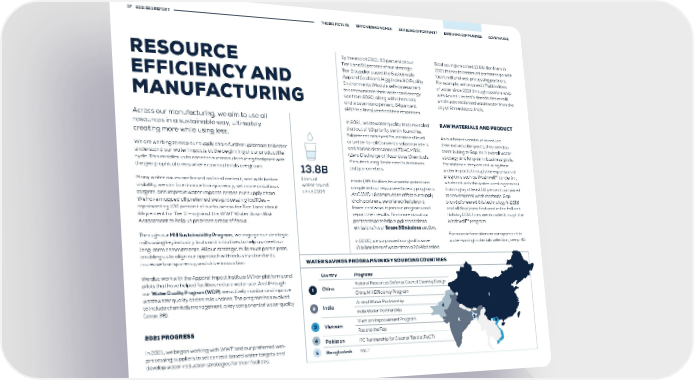 37 2021 ESG REPORT THE BIG PICTURE EMPOWERING WOMEN ENABLING OPPORTUNITY ENRICHING COMMUNITIES GOVERNANCE By the end of 2021, 99 percent of our Total savings reached 13.8 billion liters in RESOURCE Tier 1 and 91 percent of our strategic 2021 thanks to continued partnerships with Tier 2 suppliers used the Sustainable fabric mill and wet-processing partners. EFFICIENCY AND Apparel Coalition’s Higg Index 3.0 Facility For example, we’ve saved 1.7 billion liters Environmental Module self-assessment of water since 2019 through a partnership to communicate their water and energy with Arvind Limited’s Naroda denim mill, MANUFACTURING use from 2020, along with chemicals which uses reclaimed wastewater from the and waste management; 64 percent city of Ahmedabad, India. (463 facilities) verified their responses. Across our manufacturing, we aim to use all In 2021, wastewater quality tests revealed RAW MATERIALS AND PRODUCT resources in a sustainable way, ultimately that out of 53 priority denim laundries, creating more while using less. 94 percent achieved Foundational level As our brands continue to reduce or better for all Conventional parameters their individual impacts, they are also We are working to map our supply chain further upstream to better and had no detections of ZDHC MRSL contributing to Gap Inc.’s overall water understand our water impacts at the beginning of our product life (Zero Discharge of Hazardous Chemicals strategy and long-term business goals. cycle. This enables us to connect our manufacturing footprint with Manufacturing Restricted Substances For instance, they are reducing their the geographical areas where raw materials are grown. 13.8B List) parameters. water impacts through the expansion of programs such as Washwell™ for denim, Many water issues are based on local context, and with better liters of In total, 89 facilities have participated and which reduces the water used in garment visibility, we aim to enhance transparency, set more ambitious water saved completed our resource efficiency programs. finishing by at least 20 percent compared targets, and improve water impacts across our supply chain. since 2014 As COVID-19 continued to affect our supply to conventional wash methods. Gap We have mapped all preferred wet-processing facilities — chain partners, we offered flexible and brand pioneered this technology in 2016 representing 100 percent of our business for Tier 1 and about lower-cost ways to join our programs and and all Gap jeans featured in the Fall and 65 percent for Tier 2 — against the WWF Water Basin Risk report their results. Find more about our Holiday 2021 lines were made through the Assessment to help us prioritize areas of focus. partnerships to help suppliers address Washwell™ program. emissions in our Scope 3 Emissions section. Through our Mill Sustainability Program, we engage our strategic For more information on our approach to mills using key industry tools and initiatives to help us meet our In 2020, we surpassed our goal to save water-saving materials selection, see p. 42. long-term commitments. All our strategic mills must participate, 10 billion liters of water from a 2014 baseline. enabling us to align our approach with industry standards, increase transparency, and drive innovation. WATER SAVINGS PROGRAMS IN KEY SOURCING COUNTRIES We also work with the Apparel Impact Institute (Aii) on platforms and Country Programs pilots that have helped facilities reduce water use. And through Natural Resources Defense Council Clean by Design our Water Quality Program (WQP), we actively monitor and improve 1 China wastewater quality at denim laundries. The program has evolved China Mill Efficiency Program to include chemicals management, a key component of water quality Arvind Water Partnership 1 (see p. 38). 2 India 4 India Water Partnership Vietnam Improvement Program 2 5 2021 PROGRESS 3 Vietnam 3 Race to the Top In 2021, we began working with WWF and our preferred wet- 4 Pakistan IFC Partnership for Cleaner Textile (PaCT) processing suppliers to set context-based water targets and 5 Bangladesh PaCT develop water-reduction strategies for their facilities.