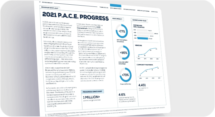 17 2021 ESG REPORT THE BIG PICTURE EMPOWERING WOMEN ENABLING OPPORTUNITY ENRICHING COMMUNITIES GOVERNANCE PROGRAM SPOTLIGHT 2021 P.A.C.E. PROGRESS 2021 IMPACT GROWTH PER YEAR WOMEN AND In 2021, we continued our three-year In Indonesia, Gap Inc. and New Balance GIRLS REACHED partnership with India’s Ministry of Rural are funding a program led by CARE 2018 178,000 Development, which we plan to expand International to integrate P.A.C.E. into across all Indian states in 2022. We the junior school counseling curriculum, +77% 2019 279,000 adapted to COVID-19 by using a virtual reaching 50 schools in Badung regency. 2020 199,000 program to train 84 trainers, including We hope to expand into other districts in 46 master trainers who will offer state- the future. 77+23+L 2021 173,7007 level trainings. communications In Bangladesh, CARE International has knowledge Ultimately, all vocational training under led a P.A.C.E. community program that VENDORS India’s flagship DDU-GKY (Deen Dayal has reached 37,198 women in Gazipur Upadhyaya Grameen Kaushalya Yojana) since 2014. An evaluation of this program 119 program will be able to offer P.A.C.E. life revealed that 48 percent of P.A.C.E. 110 skills courses, supporting the employability participants reported having bank +56% and job retention of workers. Through this accounts (non-participants: 26 percent). 68 partnership, we have gained important Moreover, 88 percent of P.A.C.E. program 61 insights about translating P.A.C.E. into participants felt comfortable speaking 56+44+L 2018 2019 2020 2021 different languages – 24 in India alone – up about their needs in the workplace and strengthening government technology after their training (non-participants: 5 execution skills systems to deliver the curriculum. 18 percent). knowledge COMMUNITY PARTNERS Also in India, our partner, the Self- In 2021, we built a learning management 35 Employed Women’s Association (SEWA), system that we plan to launch in 2022 31 achieved its goal of training over 271,000 to continue digitizing the program with 28 women across Gujarat, Bihar, and in-person, virtual, and hybrid training +73% Rajasthan. SEWA will now deliver P.A.C.E. sessions. In 2022, we also plan to use 17 in eight new countries: Ethiopia, Ghana, elements of the P.A.C.E. program to 2018 2019 2020 2021 Haiti, Kenya, Nepal, Nigeria, Sri Lanka, address women’s needs in the U.S. 73+27+L and Tanzania. financial literacy In Cambodia, we continued our programs 4,451 with Kampuchea Action to Promote certified P.A.C.E. Education. The Ministry of Education in PROGRESS SINCE 2007 trainers Cambodia passed an official order to incorporate the P.A.C.E. girls’ curriculum 4.6% into all primary and secondary schools 1 MILLION+ turnover rate for P.A.C.E.- over the next two years, ultimately women and girls reached trained women6 compared reaching 150 schools and almost to 11.3% among their peers 15,000 girls. 5. Execution skills knowledge is defined as the knowledge of how to apply newly learned skills from the P.A.C.E. learning modules in real contexts, particularly in the workplace. Percentage represents increase in proficiency after participating in the P.A.C.E. program. 6. According to a sample of 40 facilities. 7. P.A.C.E. programming and participation were limited in 2020 and 2021 due to COVID-19 in-person gathering restrictions across many of our implementing locations.