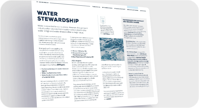 35 2021 ESG REPORT THE BIG PICTURE EMPOWERING WOMEN ENABLING OPPORTUNITY ENRICHING COMMUNITIES GOVERNANCE WATER PARTNERSHIPS FOR ADVOCACY STEWARDSHIP AND INDUSTRY CHANGE We collaborate in several initiatives to In recognition of our address water scarcity, improve access efforts to manage the to water and sanitation, and support Water is essential for our business. However, the garment risks and opportunities water-saving innovation in manufacturing, industry often sources from locations where demand for related to water security, such as Water Resilience Coalition, water is high and water stress is often a major issue. we received an A- rating WASH4Work, and Ceres Connect the from CDP Water in 2021. Drops. Highlights of our additional engagements include: For this reason, much of our water Our programs and collaborations are stewardship work focuses on high-volume designed to tackle different water • World Water Day: In March 2021, Mark suppliers operating in areas of water challenges, mobilize broader business Breitbard, President and CEO of Gap risk, where we can partner to introduce action, and raise awareness of these brand, spoke at a UNGC CEO Water innovative local solutions. critical issues. We focus on three Mandate event to highlight the value interconnected areas: of water for business. By engaging with our suppliers, we can help them to implement industry 1. Women + Water (p. 36) • World Water Week: In August 2021, and Gap Inc. programs (such as our 2. Resource Efficiency and we participated in seven SIWI World Mill Sustainability and Water Quality Manufacturing (p. 37) Water Week panels. Among the areas programs) around water quality and 3. Raw Materials and Product (p. 37) covered were the business case for efficiency, so that they can meet our building community water resilience, water-savings targets. As a founding 2021 Progress how water strategy can drive strategic member of the Water Resilience Coalition, In 2021, we embarked on a water business value, partnerships to catalyze we support its ambitious 2050 goals: strategy-setting process with corporate that will serve as the foundation for innovation in water use in apparel water stewardship experts at the long-term science-based targets manufacturing, and how we’re tackling > Positive water impact in water-stressed Water Foundry. We also engaged more (SBTs) for water. the water and climate crises with more regions. than 20 leading stakeholders and water sustainable cotton sourcing. > Water-resilient value chains experts to gather feedback on our Looking forward, we plan to build > Global leadership to raise the ambition preliminary water strategy across raw upon these expert insights, our • Water Innovation Center for of water resilience materials, manufacturing, and customer strong foundation of community Apparel: Together with global textile communities through a roundtable water-resilience work from the USAID manufacturer Arvind Limited, we are We work strategically to use water more discussion facilitated by Ceres. Gap Inc. Women + Water Alliance, building an 18,000-square-foot Water efficiently in our products, especially and our water-saving practices in Innovation Center for Apparel in India. through raw material sourcing and To guide our future strategy, we are manufacturing as we pursue a path The center, due to open in 2022, will manufacturing. We aim to eliminate water working with World Wildlife Fund (WWF) to building a more water-resilient showcase water-management best contamination from chemicals, improve to concentrate our water stewardship value chain. practices and recycling technologies. awareness and access to water and activities in water-stressed regions along sanitation (particularly among women), our value chain and develop a framework Find more about our approach to and invest in opportunities to build for community water resilience. WWF is working with suppliers, our industry community water resilience and catalyze also helping us assess our macro-level partnerships, and the tools we use water innovation. water risk across our supply chain and to enhance water stewardship on set new context-based water goals our website.
