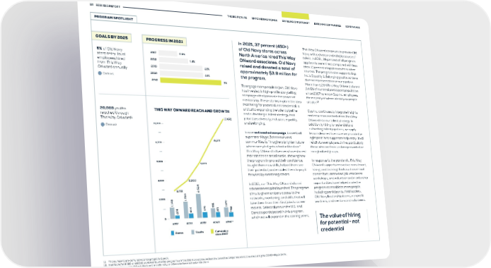 28 2021 ESG REPORT THE BIG PICTURE EMPOWERING WOMEN ENABLING OPPORTUNITY ENRICHING COMMUNITIES GOVERNANCE PROGRAM SPOTLIGHT GOALS BY 2025 PROGRESS IN 2021 In 2021, 37 percent (450+) This Way ONward continues to provide Old of Old Navy stores across Navy with a diverse and reliable source of 5% of Old Navy North America hired This Way talent. In 2021, 39 percent of all program 2017 0.9% ONward associates. Old Navy applicants were hired, compared with less store entry-level than 10 percent of applicants from other employees hired 2018 1.4% raised and donated a total of from This Way sources. The program also supports Gap ONward annually 2019 2.1% approximately $3.8 million for Inc.’s Equality & Belonging goal to achieve 2020 2.1% the program. diverse representation in our pipeline. On track More than 1,294 This Way ONward alumni 2021 3% To engage more people to join, Old Navy (14.6% of our total participant population has invested in high-profile storytelling since 2007) are now Gap Inc. employees, campaigns that promote the power of the majority of whom identify as people 13 mentorship. These stories explore the idea of color. that hiring for potential, not credential, is 20,000 youths THIS WAY ONWARD REACH AND GROWTH critical to expanding the talent pipeline Gap Inc. continues to integrate insights reached through and cultivating a talent strategy that and new resource tools from This Way This Way ONward11 10,672 prioritizes diversity, inclusion, equality, ONward into our talent strategy. In 10,000 and belonging. addition to hiring for potential and On track cultivating talent pipelines, we apply In one national ad campaign, basketball lessons learned to ensure we provide the superstar Magic Johnson invited right post-hire support to help entry-level 8,201 communities to “imagine a brighter future retail store employees thrive, particularly 8,000 where every kid gets a foot in the door.” those who are from underrepresented or This Way ONward Influencers have shared marginalized groups. their stories on social media, showing how 6,000 the program improved their confidence, In response to the pandemic, This Way 5,677 taught them new skills, helped them see ONward supports innovative recruitment, their potential, and enabled them to pay it hiring, and training. Tools such as virtual forward by mentoring others. career fairs, interviews, job-readiness 4,000 3,900 workshops, and volunteer and mentorship 24 In 2021, our This Way ONward alumni opportunities have helped make the 5 2,713 , advancement pilot launched. The program program accessible to more people, 2 0 aims to give members access to the including participants, field leaders, 70 2,000 , 8 1 networks, mentoring, and skills that will Old Navy leadership teams, nonprofit 14 70 , 1 1 12 , take them from their first jobs to career partners, and mentors and volunteers. 76 9 1 1 2 74 444 5 47 45 rockets. Select alumni in the U.S. and 2 Canada participated in this program, 0 which we will expand in the coming years. The value of hiring 12 2017 2018 2019 2020 2021 for potential - not Stores Youths Cumulative since 2007 credential 11. The numbers are cumulative since program launch. 12. Numbers for 2020 and 2021 are lower due to the program’s shift to Old Navy stores exclusively, as well as temporary store closures during the COVID-19 pandemic. 13. Excludes those who did not disclose their ethnicity or otherwise have not submitted one.