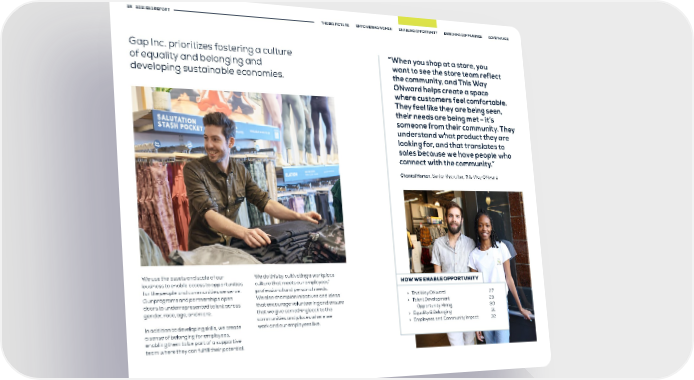 26 2021 ESG REPORT THE BIG PICTURE EMPOWERING WOMEN ENABLING OPPORTUNITY ENRICHING COMMUNITIES GOVERNANCE Gap Inc. prioritizes fostering a culture “ When you shop at a store, you of equality and belonging and want to see the store team reflect developing sustainable economies. the community, and This Way ONward helps create a space where customers feel comfortable. They feel like they are being seen, their needs are being met – it’s someone from their community. They understand what product they are looking for, and that translates to sales because we have people who connect with the community.” Chantal Horton, Senior Recruiter, This Way ONward We use the assets and scale of our We do this by cultivating a workplace business to enable access to opportunities culture that meets our employees‘ HOW WE ENABLE OPPORTUNITY for the people and communities we serve. professional and personal needs. Our programs and partnerships open We also champion initiatives and ideas > This Way ONward 27 doors to underrepresented talent across that encourage volunteering and ensure > Talent Development 29 gender, race, age, and more. that we give something back to the Opportunity Hiring 30 communities and places where we > Equality & Belonging 31 In addition to developing skills, we create work and our employees live. > Employees and Community Impact 32 a sense of belonging for employees, enabling them to be part of a supportive team where they can fulfill their potential.