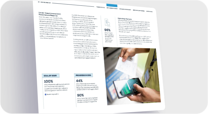 23 2021 ESG REPORT THE BIG PICTURE EMPOWERING WOMEN ENABLING OPPORTUNITY ENRICHING COMMUNITIES GOVERNANCE Gender-Based Violence (GBV) Our GBV Prevention and Response Digital Wage Payments Prevention and Response Program focuses on training managers We work closely with partners and participate in the UN’s Over the years, our regular facility and workers as a key part of our Better Than Cash Alliance to address ongoing regulatory assessments have revealed violations strategy. In 2021, we set a goal of and infrastructure constraints on digital wage payments. related to gender-based discrimination ensuring that all our factories have We continue to prioritize digital wage payments with and harassment. We recognize that it’s GBV training, prevention, and response new Tier 1 suppliers and support financial inclusion more not enough to rely solely on auditing to systems in place by 2025. By 2023, 96% broadly by offering digital financial literacy sessions in our detect and address these issues, which we aim to ensure that all workers P.A.C.E. curriculum. is why we developed our GBV Prevention in factories where our clothes are of our eligible and Response Program with Better produced undergo GBV prevention and Tier 1 suppliers Since starting our Digital Wage Program in 2017, we have Work to help enforce our zero-tolerance response training annually. (that provided increased the share of our eligible Tier 1 suppliers that policy on physical, psychological, and data) offer offer digital wage payment systems from 68 to 96 percent sexual harassment. Looking ahead, we will further assess digital wage (which includes mobile wallets, bank accounts, debit cards, the extent to which factories have a payments and other digitally accessible methods). functioning grievance mechanism for workers to report incidents of GBV, harassment, and abuse. To have an impact beyond the facilities we work with, we are also exploring partnerships to further accelerate this work across the industry with expert organizations and other major apparel brands. GOAL BY 2025 PROGRESS IN 2021 100% 44% of our factories will have prevention of our factories have started and response management training on GBV Prevention and systems and trainings in place to Response, reaching over 231,500 address gender-based violence workers (26% of our supply chain) Establishing baseline 90% of our factories had completed gender awareness training for middle and top management