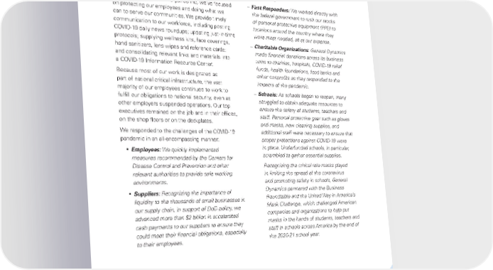 Employee and Community Well-Being 44 COVID-19 Serving Our Communities in Their Time of Need Throughout the COVID-19 pandemic, we’ve focused on protecting our employees and doing what we can to serve our communities. We provide timely communication to our workforce, including posting COVID-19 daily news roundups; updating just-in-time protocols; supplying wellness kits, face coverings, hand sanitizers, lens wipes and reference cards; and consolidating relevant links and materials into a COVID-19 Information Resource Center. Because most of our work is designated as part of national critical infrastructure, the vast majority of our employees continued to work to fulfill our obligations to national security, even as other employers suspended operations. Our top executives remained on the job and in their offices, on the shop floors or on the deckplates. We responded to the challenges of the COVID-19 pandemic in an all-encompassing manner: y Employees: We quickly implemented measures recommended by the Centers for Disease Control and Prevention and other relevant authorities to provide safe working environments. y Suppliers: Recognizing the importance of liquidity to the thousands of small businesses in our supply chain, in support of DoD policy, we advanced more than $2 billion in accelerated cash payments to our suppliers to ensure they could meet their financial obligations, especially to their employees. y Communities – First Responders: We worked directly with the federal government to rush our stocks of personal protective equipment (PPE) to locations around the country where they were most needed, all at our expense. – Charitable Organizations: General Dynamics made financial donations across its business units to charities, hospitals, COVID-19 relief funds, health foundations, food banks and other nonprofits as they responded to the impacts of the pandemic. – Schools: As schools began to reopen, many struggled to obtain adequate resources to ensure the safety of students, teachers and staff. Personal protective gear such as gloves and masks, new cleaning supplies, and additional staff were necessary to ensure that proper protections against COVID-19 were in place. Underfunded schools, in particular, scrambled to gather essential supplies. Recognizing the critical role masks played in limiting the spread of the coronavirus and promoting safety in schools, General Dynamics partnered with the Business Roundtable and the United Way in America’s Mask Challenge, which challenged American companies and organizations to help put masks in the hands of students, teachers and staff in schools across America by the end of the 2020-21 school year.