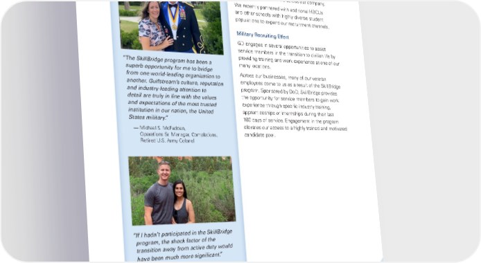 Engagement and Development 35 ” The SkillBridge program has been a superb opportunity for me to bridge from one world-leading organization to another. Gulfstream’s culture, reputation and industry-leading attention to detail are truly in line with the values and expectations of the most trusted institution in our nation, the United States military.” — Michael S. McFadden, Operations Sr. Manager, Completions, Retired U.S. Army Colonel ” If I hadn’t participated in the SkillBridge program, the shock factor of the transition away from active duty would have been much more significant.” — Cameron Dunkin, Sr., Systems Administrator, Former U.S. Air Force Staff Sergeant Early Career Programs (Internships and Co-Ops) We engage in multiple efforts to increase the number of diverse interns across our company. We recently partnered with additional HBCUs and other schools with highly diverse student populations to expand our recruitment channels. Military Recruiting Effort GD engages in several opportunities to assist service members in the transition to civilian life by providing training and work experience at one of our many locations. Across our businesses, many of our veteran employees come to us as a result of the SkillBridge program. Sponsored by DoD, SkillBridge provides the opportunity for service members to gain work experience through specific industry training, apprenticeships or internships during their last 180 days of service. Engagement in the program elevates our access to a highly trained and motivated candidate pool.