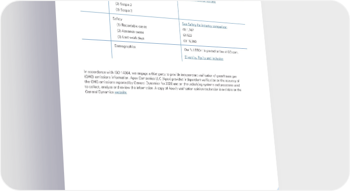 Index 58 In addition to the SASB Aerospace and Defense items above, we also report on the following items. Greenhouse gas emissions (1) Scope 1 (2) Scope 2 (3) Scope 3 Greenhouse Gas Emissions Safety (1) Recordable cases (2) Absence cases (3) Lost work days See Safety for industry comparison (1) 1,747 (2) 522 (3) 15,960 Demographics Our full EEO-1 is posted online at GD.com. Diversity, Equity and Inclusion In accordance with ISO 14064, we engage a third party to provide independent verification of greenhouse gas (GHG) emissions information. Apex Companies LLC (Apex) provided independent verification on the accuracy of the GHG emissions reported by General Dynamics for 2020 and on the underlying systems and processes used to collect, analyze and review the information. A copy of Apex’s verification opinion declaration is available on the General Dynamics website .