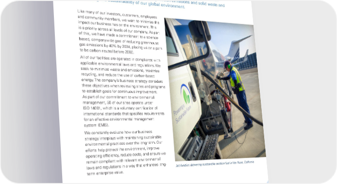Environment 48 Environmental Responsibility General Dynamics takes our obligation to be a responsible corporate citizen seriously. We are committed to reducing carbon emissions and solid waste and promoting the sustainability of our global environment. Like many of our investors, customers, employees and community members, we want to minimize the impact our business has on the environment. This is a priority across all levels of our company. As part of this, we have made a commitment to a science- based, companywide goal of reducing greenhouse gas emissions by 40% by 2034, placing us on a path to be carbon neutral before 2060. All of our facilities are operated in compliance with applicable environmental laws and regulations. We seek to minimize waste and emissions, maximize recycling, and reduce the use of carbon-based energy. The company’s business strategy considers these objectives when reviewing sites and programs to establish goals for continuous improvement. As part of our commitment to environmental management, 58 of our sites operate under ISO 14001, which is a voluntary certification of international standards that specifies requirements for an effective environmental management system (EMS). We constantly evaluate how our business strategy interplays with maintaining sustainable environmental practices over the long term. Our efforts help protect the environment, improve operating efficiency, reduce costs, and ensure we remain compliant with relevant environmental laws and regulations in a way that enhances long- term enterprise value. Jet Aviation delivering sustainable aviation fuel in Van Nuys, California