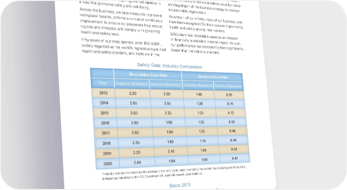 Our Culture 25 Safety Maintaining a safe working environment for our employees is paramount. We have clear, consistent policies and standards requiring that we operate in a way that promotes safety and well-being. Across the business, we take measures to prevent workplace hazards, enforce a culture of continuous improvement to ensure our processes help reduce injuries and illnesses, and comply with governing health and safety laws. Fifty-seven of our sites operate under ISO 45001, widely regarded as the world’s highest occupational health and safety standard, and more are in the process of achieving certification. Under ISO 45001, workplace safety is not a standalone issue but rather an integral part of the business strategy to maintain a sustainable organization. As a result of our efforts, many of our business units have been recognized for their success in promoting health and safety among their workers. SASB identifies recordable cases as an indicator of financially sustainable material impact. As such, our performance has consistently been significantly better than the industry standard. *Industry standard numbers are the average of the recordable cases reported by the Aircraft Manufacturing and Shipbuilding & Repairing industries to the U.S. Department of Labor’s Bureau of Labor Statistics. Safety Data: Industry Comparison Recordable Cases Lost Work Days Absence Cases Since 2013 - 36 % - 38 % - 51 % Recordable Case Rate Absence Case Rate Year Industry Standard General Dynamics Industry Standard General Dynamics 2013 3.30 2.69 1.40 0.81 2014 2.85 2.65 1.30 0.79 2015 3.05 2.25 1.25 0.72 2016 2.80 1.90 1.25 0.58 2017 2.65 1.64 1.25 0.44 2018 2.35 1.83 1. 1 5 0.54 2019 2.20 2.10 1.05 0.53 2020 2.40 1.64 1.50 0.47