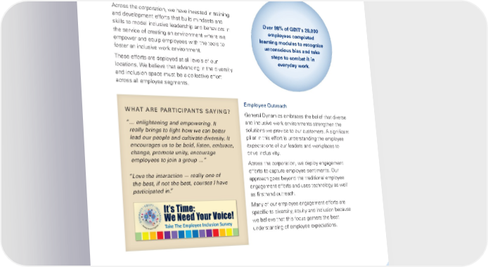 Engagement and Development 29 Over 98% of GDIT's 28,000 employees completed learning modules to recognize unconscious bias and take steps to combat it in everyday work. Developing an Inclusive Mindset Sustainable diversity and inclusion efforts start with developing a mindset that supports and leads a culture of inclusivity. Across the corporation, we have invested in training and development efforts that build mindsets and skills to model inclusive leadership and behaviors in the service of creating an environment where we empower and equip employees with the tools to foster an inclusive work environment. These efforts are deployed at all levels of our locations. We believe that advancing in the diversity and inclusion space must be a collective effort across all employee segments. WHAT ARE PARTICIPANTS SAYING? “ ... enlightening and empowering. It really brings to light how we can better lead our people and cultivate diversity. It encourages us to be bold, listen, embrace, change, promote unity, encourage employees to join a group ...” “ Love the interaction — really one of the best, if not the best, courses I have participated in.” Employee Outreach General Dynamics embraces the belief that diverse and inclusive work environments strengthen the solutions we provide to our customers. A significant pillar in this effort is understanding the employee expectations of our leaders and workplaces to drive inclusivity. Across the corporation, we deploy engagement efforts to capture employee sentiments. Our approach goes beyond the traditional employee engagement efforts and uses technology as well as firsthand outreach. Many of our employee engagement efforts are specific to diversity, equity and inclusion because we believe that this focus garners the best understanding of employee expectations.