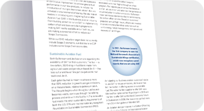 Environment 52 Reducing Scope 3 Emissions General Dynamics is committed to reducing Scope 3 emissions, which are indirect emissions that are the result of a company’s value chain. We use a process of continuous improvement to achieve greater fuel performance in our new products, to include the introduction of multiple clean-sheet aircraft that are unrivaled in environmental efficiency. We are market leaders in introducing and integrating Sustainable Aviation Fuel (SAF) in the business aviation industry. From building aircraft to run on SAF to implementing carbon offset and book-and-claim programs to making SAF readily available at our facilities, we are making a concerted effort to reduce our Scope 3 emissions. While our GHG reduction target does not currently include Scope 3 elements, our disclosure to CDP includes some Scope 3 emissions data. Sustainable Aviation Fuel Both Gulfstream and Jet Aviation are expanding the availability of SAF for their customers. The fuel — a low-carbon, 30/70 drop-in fuel blend made from agricultural waste and petroleum-based Jet-A — has less sulfur and fewer fine particle pollutants than traditional Jet-A. Each gallon burned is meant to achieve a more than 80% reduction in greenhouse gas emissions, on a lifecycle basis, relative to petroleum Jet-A. The lifecycle begins when the agricultural source becomes waste, continues through the refining process and ends with the fuel burn. The renewable fuel meets the strict sustainability requirements of both the U.S. EPA and the internationally recognized Roundtable on Sustainable Biomaterials (RSB). Gulfstream was the first business jet aircraft manufacturer to use SAF in daily operations. Since 2016, Gulfstream has used SAF to power its Savannah-based demonstration aircraft, flying more than 1.7 million nautical miles on the blend. Gulfstream also offers aircraft operators the opportunity to reduce the carbon footprint associated with their flights through an offset program. Participants pay an annual fee based on aircraft utilization to fund activities that generate an equal reduction in carbon emissions. Gulfstream does not charge operators a fee for administering its carbon offset service. Based on customers’ projected annual flight hours, offsets are invested in environmentally beneficial activities such as wind energy, forest management, farm power and recovery of landfill gas. Anticipating our business aviation customers’ desire to use SAF to reduce emissions, Jet Aviation has led the market in offering access to sustainable fuel. We were the first supplier to offer SAF via a blended fuel option at Van Nuys Airport in 2019 and the first to offer SAF at the World Economic Forum in Switzerland in 2020. We have since uplifted more than 3.5 million gallons of blended SAF. Jet Aviation also participates in a Carbon Offsetting and Reduction Scheme for International Aviation (CORSIA), EU Emissions Trading System (EU ETS), and other carbon offset and carbon reduction schemes to lower CO 2 emissions for international flights to curb the aviation impact on climate change. In 2021, Gulfstream became the first company to earn the National Aeronautic Association’s Sustainable Wings certification, which now recognizes speed records that are set using SAF.