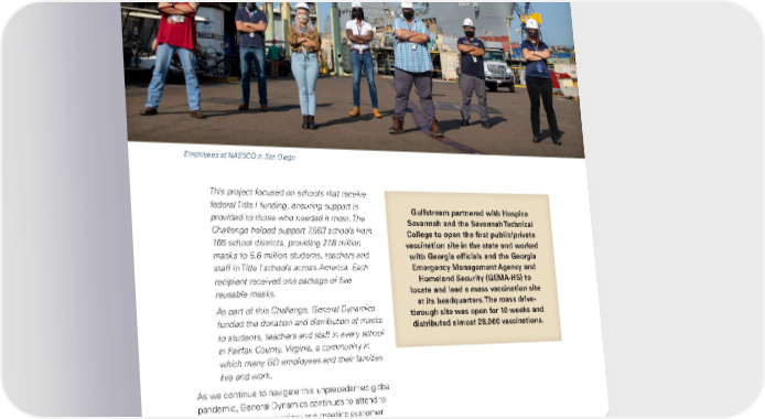 Employee and Community Well-Being 45 This project focused on schools that receive federal Title I funding, ensuring support is provided to those who needed it most. The Challenge helped support 7,563 schools from 165 school districts, providing 27.8 million masks to 5.6 million students, teachers and staff in Title I schools across America. Each recipient received one package of five reusable masks. As part of this Challenge, General Dynamics funded the donation and distribution of masks to students, teachers and staff in every school in Fairfax County, Virginia, a community in which many GD employees and their families live and work . Gulfstream partnered with Hospice Savannah and the Savannah Technical College to open the first public/private vaccination site in the state and worked with Georgia officials and the Georgia Emergency Management Agency and Homeland Security (GEMA-HS) to locate and lead a mass vaccination site at its headquarters. The mass drive- through site was open for 10 weeks and distributed almost 28,000 vaccinations. As we continue to navigate this unprecedented global pandemic, General Dynamics continues to attend to employee health and safety and meeting customer commitments, while remaining profitable and paying a steady dividend. Ultimately, the most responsible and sustainable action we can take for our employees and communities is to remain vibrant and solvent. Employees at NASSCO in San Diego