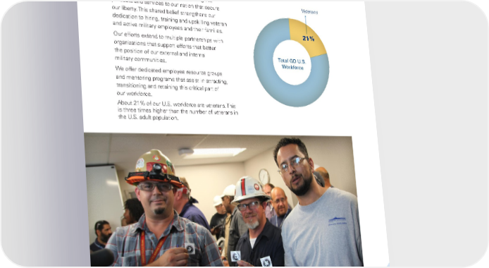 Our Culture 28 Veteran Representation General Dynamics is committed to hiring and retaining the best talent. We believe that our veterans share our devotion to providing the products and services to our nation that secure our liberty. This shared belief strengthens our dedication to hiring, training and upskilling veteran and active military employees and their families. Our efforts extend to multiple partnerships with organizations that support efforts that better the position of our external and internal military communities. We offer dedicated employee resource groups and mentoring programs that assist in attracting, transitioning and retaining this critical part of our workforce. About 21% of our U.S. workforce are veterans. This is three times higher than the number of veterans in the U.S. adult population. 21% Veterans In 2020, we hired 2,209 veterans of the U.S. armed forces. Total GD U.S. Workforce Veterans Day event at NASSCO