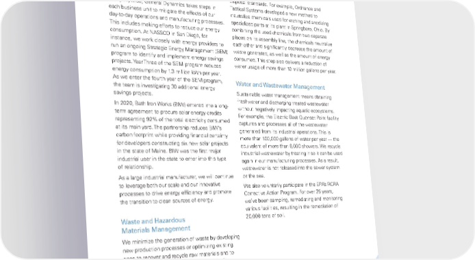 Environment 55 Mitigating Ecological Impact Energy Management Companywide, General Dynamics takes steps in each business unit to mitigate the effects of our day-to-day operations and manufacturing processes. This includes making efforts to reduce our energy consumption. At NASSCO in San Diego, for instance, we work closely with energy providers to run an ongoing Strategic Energy Management (SEM) program to identify and implement energy savings projects. Year Three of the SEM program reduced energy consumption by 1.3 million kWh per year. As we enter the fourth year of the SEM program, the team is investigating 30 additional energy savings projects. In 2020, Bath Iron Works (BIW) entered into a long- term agreement to procure solar energy credits representing 92% of the total electricity consumed at its main yard. The partnership reduces BIW’s carbon footprint while providing financial certainty for developers constructing six new solar projects in the state of Maine. BIW was the first major industrial user in the state to enter into this type of relationship. As a large industrial manufacturer, we will continue to leverage both our scale and our innovative processes to drive energy efficiency and promote the transition to clean sources of energy. Waste and Hazardous Materials Management We minimize the generation of waste by developing new production processes or optimizing existing ones to recover and recycle raw materials and to dispose of unrecyclable waste in a sustainable manner and in accordance with the strictest waste disposal standards. For example, Ordnance and Tactical Systems developed a new method to neutralize chemicals used for etching and anodizing specialized parts at its plant in Springboro, Ohio. By combining the used chemicals from two separate places on its assembly line, the chemicals neutralize each other and significantly decrease the amount of waste generated, as well as the amount of energy consumed. This step also delivers a reduction of water usage of more than 10 million gallons per year. Water and Wastewater Management Sustainable water management means obtaining freshwater and discharging treated wastewater without negatively impacting aquatic ecosystems. For example, the Electric Boat Quonset Point facility captures and processes all of the wastewater generated from its industrial operations. This is more than 100,000 gallons of water per year — the equivalent of more than 6,000 showers. We recycle industrial wastewater by treating it so it can be used again in our manufacturing processes. As a result, wastewater is not released into the sewer system or the sea. We also voluntarily participate in the EPA’s RCRA Corrective Action Program. For over 25 years, we’ve been sampling, remediating and monitoring various facilities, resulting in the remediation of 20,000 tons of soil.