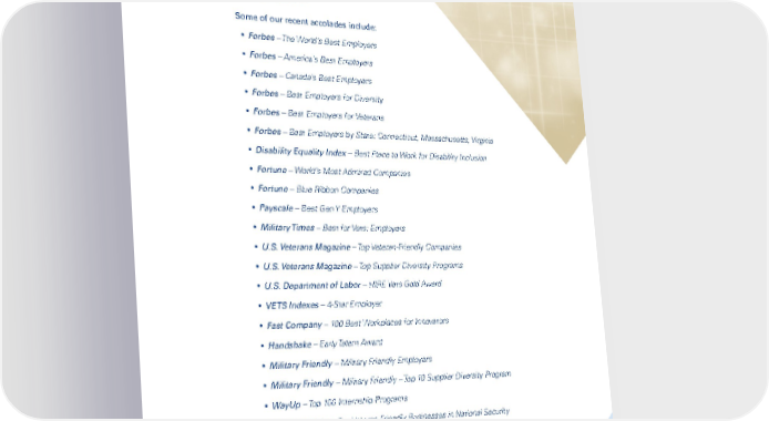 Employee and Community Well-Being 46 Honors and Awards General Dynamics is proud to have been recognized as a world-leading employer. Some of our recent accolades include: y Forbes – The World’s Best Employers y Forbes – America’s Best Employers y Forbes – Canada’s Best Employers y Forbes – Best Employers for Diversity y Forbes – Best Employers for Veterans y Forbes – Best Employers by State: Connecticut, Massachusetts, Virginia y Disability Equality Index – Best Place to Work for Disability Inclusion y Fortune – World’s Most Admired Companies y Fortune – Blue Ribbon Companies y Payscale – Best Gen Y Employers y Military Times – Best for Vets: Employers y U.S. Veterans Magazine – Top Veteran-Friendly Companies y U.S. Veterans Magazine – Top Supplier Diversity Programs y U.S. Department of Labor – HIRE Vets Gold Award y VETS Indexes – 4-Star Employer y Fast Company – 100 Best Workplaces for Innovators y Handshake – Early Talent Award y Military Friendly – Military Friendly Employers y Military Friendly – Military Friendly – Top 10 Supplier Diversity Program y WayUp – Top 100 Internship Programs y ClearanceJobs – Top Veteran-Friendly Businesses in National Security y Professional Women’s Magazine – Top Employer y Professional Women’s Magazine – Top Supplier Diversity Programs y National Organization on Disability – Leading Disability Employer