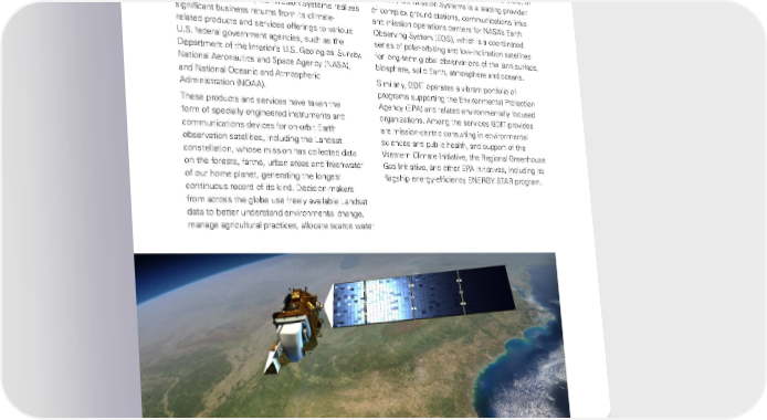Environment 54 Business Lines Supporting Environmental Initiatives Several of our business units’ contracts support the U.S. government’s efforts to mitigate ecological impacts. For instance, GD Mission Systems realizes significant business returns from its climate- related products and services offerings to various U.S. federal government agencies, such as the Department of the Interior’s U.S. Geological Survey, National Aeronautics and Space Agency (NASA), and National Oceanic and Atmospheric Administration (NOAA). These products and services have taken the form of specially engineered instruments and communications devices for on-orbit Earth observation satellites, including the Landsat constellation, whose mission has collected data on the forests, farms, urban areas and freshwater of our home planet, generating the longest continuous record of its kind. Decision-makers from across the globe use freely available Landsat data to better understand environmental change, manage agricultural practices, allocate scarce water resources, respond to natural disasters and more. In addition, GD Mission Systems is a leading provider of complex ground stations, communications links and mission operations centers for NASA’s Earth Observing System (EOS), which is a coordinated series of polar-orbiting and low-inclination satellites for long-term global observations of the land surface, biosphere, solid Earth, atmosphere and oceans. Similarly, GDIT operates a vibrant portfolio of programs supporting the Environmental Protection Agency (EPA) and related environmentally focused organizations. Among the services GDIT provides are mission-centric consulting in environmental sciences and public health, and support of the Western Climate Initiative, the Regional Greenhouse Gas Initiative, and other EPA initiatives, including its flagship energy-efficiency ENERGY STAR program. GD Missions Systems is building the operations center to support Landsat missions.