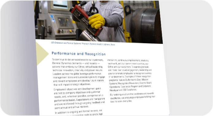 Our Culture 30 Performance and Recognition To continue to deliver excellence to our customers, General Dynamics demands — and rewards — actions that embody our Ethos: ethical leadership, technical innovation, creativity and proven results. Leaders across the globe leverage performance management tools and succession plans to engage and reward employees and develop future leaders that will impact strategic objectives. Employees’ objectives and development goals are tied to company objectives and customer needs, and, wherever possible, compensation is performance-based. Expectations are transparent and are reinforced through ongoing feedback and semi-annual and annual reviews. In addition to ongoing and formal reviews, we employ various recognition tools to encourage innovation, continuous improvement, creativity, teamwork, and our commitment to ethics, our Ethos and our customers. To express gratitude and foster continued engagement, leadership and peers nominate employees to recognize a variety of achievements. Examples of these recognition programs include Gulfstream’s Soar, Mission Systems’ Recognition Revolution, Electric Boat’s Operational Excellence Program and Corporate Headquarters’ GD Excellence. By fostering a culture that celebrates and rewards excellence, we encourage employees to bring their best to work every day. GD Ordnance and Tactical Systems’ Precision Systems facility in Garland, Texas