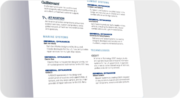 Our Business 8 AEROSPACE Gulfstream produces the world’s most technologically advanced business jets and offers unmatched customer support. Jet Aviation provides comprehensive business aviation services, custom completions, and a global network of facilities for aircraft owners and operators. MARINE SYSTEMS Bath Iron Works designs and builds guided missile destroyers for the U.S. Navy and provides repair services for multiple ship classes. Electric Boat is the premier designer and builder of nuclear-powered submarines for the U.S Navy. NASSCO specializes in the design and construction of auxiliary and support ships, oil tankers, and dry cargo carriers, and is a major provider of repair services for the U.S. Navy. COMBAT SYSTEMS European Land Systems is a global leader in the design and manufacture of wheeled and tracked combat vehicles and bridge systems. Land Systems produces highly capable military vehicles, including the Abrams tank, Stryker combat vehicle and Light Armored Vehicle. Ordnance and Tactical Systems is a leading designer, developer and manufacturer of munitions, weapons and tactical systems. TECHNOLOGIES Information Technology (GDIT) designs, builds and operates large-scale enterprise information systems for the U.S. government, its agencies and others to deliver a broad range of technical, professional and training services. Mission Systems is a leading C5ISR integrator of secure communications and command-and- control systems, sensors and cyber products. Our Business Units