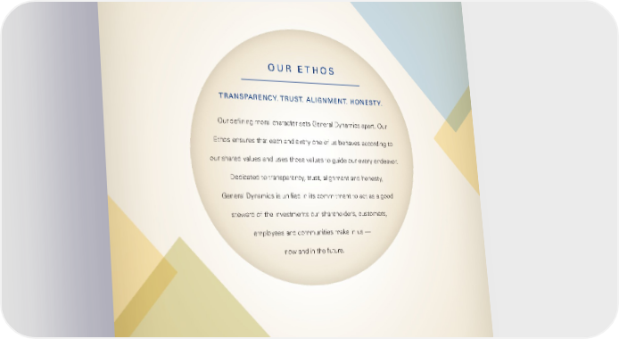 OUR ETHOS TRANSPARENCY. TRUST. ALIGNMENT. HONESTY. Our defining moral character sets General Dynamics apart. Our Ethos ensures that each and every one of us behaves according to our shared values and uses those values to guide our every endeavor. Dedicated to transparency, trust, alignment and honesty, General Dynamics is unified in its commitment to act as a good steward of the investments our shareholders, customers, employees and communities make in us — now and in the future.