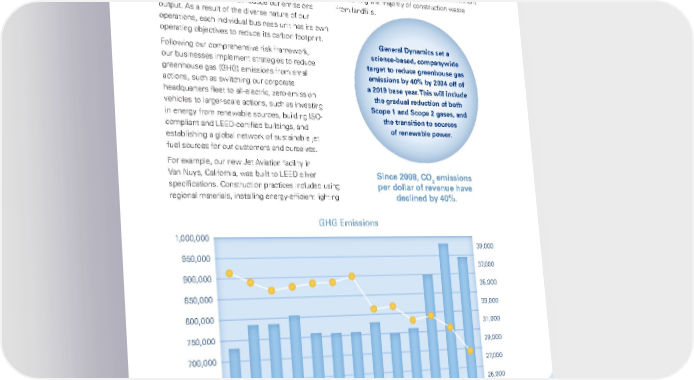 Environment 50 Greenhouse Gas Emissions As a company, we are committed to continuous improvement, which includes creating efficiencies and building systems that reduce our emissions output. As a result of the diverse nature of our operations, each individual business unit has its own operating objectives to reduce its carbon footprint. Following our comprehensive risk framework, our businesses implement strategies to reduce greenhouse gas (GHG) emissions from small actions, such as switching our corporate headquarters fleet to all-electric, zero-emission vehicles to larger-scale actions, such as investing in energy from renewable sources, building ISO- compliant and LEED-certified buildings, and establishing a global network of sustainable jet fuel sources for our customers and ourselves. For example, our new Jet Aviation facility in Van Nuys, California, was built to LEED silver specifications. Construction practices included using regional materials, installing energy-efficient lighting and low-flow plumbing fixtures, and a commitment to diverting the majority of construction waste from landfills. Emissions (Metric Tons CO 2 ) Revenue (in millions of dollars) 1,000,000 950,000 900,000 850,000 800,000 750,000 700,000 650,000 600,000 39,000 37,000 35,000 33,000 31,000 29,000 27,000 25,000 2009 2010 2011 2012 2013 2014 2015 2016 2017 2018 2019 2020 GHG Emissions Emissions (Metric Tons CO 2 ) Revenue (in millions of dollars) Since 2008, CO 2 emissions per dollar of revenue have declined by 40%. General Dynamics set a science-based, companywide target to reduce greenhouse gas emissions by 40% by 2034 off of a 2019 base year. This will include the gradual reduction of both Scope 1 and Scope 2 gases, and the transition to sources of renewable power. 2008