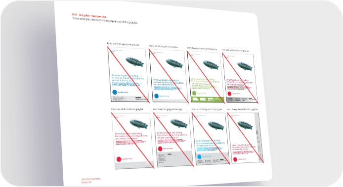 8.04 Gray Bar: Improper Use These examples demonstrate improper uses of the gray bar. Don’t use large type in the gray bar. Don’t use the gray bar without text. Don’t change the color of the gray bar. Don’t add gradations to the gray bar. GE Commercial Finance GE Commercial Finance GE Commercial Finance GE Commercial Finance Lending Lending Lending Lending When Goodyear was looking When Goodyear was looking When Goodyear was looking for creative restructuring solutions, When Goodyear was looking f g , for creative restructuring solutions, we rose to the occasion. for creative restructuring solutions, or creative restructurin solutions “These new agreements, including the new $1.3B ABL facility, will provide Goodyear we rose to the occasion. we rose to the occasion. with additional financial flexibility and liquidity.” Robert J. Keegan, Goodyear’s President & CEO. “ g g $ y p y r “These new agreements, including the new $1.3B ABL facility, will provide Goodyear In March of 2003, GE National Restructuring Group provided The Goodyear Tire & Rubber we rose to the occasion. These new a reements, includin the new 1.3B ABL facilit , will rovide Good ea ” r’s esde t&C O. with additional financial flexibility and liquidity.” Robert J. Keegan, Goodyear’s President & CEO. Company with a $200 Million of a $1.3 Billion Asset-Based Facility. with additional financial flexibility and liquidity. Robert J. Keegan, Goodyea Pr i n E “These new agreements, including the new $1.3B ABL facility, will provide Goodyear In March of 2003, GE National Restructuring Group provided The Goodyear Tire & Rubber In March of 2003, GE National Restructuring Group provided The Goodyear Tire & Rubber with additional financial flexibility and liquidity.” Robert J. Keegan, Goodyear’s President & CEO. Company with a $200 Million of a $1.3 Billion Asset-Based Facility. Company with a $200 Million of a $1.3 Billion Asset-Based Facility. In March of 2003, GE National Restructuring Group provided The Goodyear Tire & Rubber Company with a $200 Million of a $1.3 Billion Asset-Based Facility. i g k imagination at work imagination at work ma ination at wor imagination at work R bb kk •• Nor Norwwaalklk,, C CTT •• 203-852-361203-852-36188 GE National Restructuring Group Ron Kubrick • Norwalk, CT • 203-852-3618 Michael Scott • Beverly Hills, CA • 310-284-2740 Ron Kon Kuu ricric yy •• 3 31010--28284-4-22747400 gg pp MMichael Scott ichael Scott •• Bever Beverll Hills, CA Hills, CA GE National Restructuring Group GE National RestructurinGE National Restructurin G Grroouu gg •• 3312-441-7212-441-725555 Stuart Armstrong • Managing Director Colleen Palmer • Chicago, IL • 312-441-7255 Craig Reese • Atlanta, GA • 678-320-8942 SStuartuart Armstt Armstrroongng •• Managing Dir Managing Directectoorr CoColllleeeen Pn Paalmlmeerr •• Chic Chicaa o, IL o, IL CCraig Reeseraig Reese •• AAttllantaanta,, GA GA •• 667788-3-32020--89894422 PPenennnyy Frie Frieddman man •• C Chhicicaaggo, ILo, IL •• 331212-4-4663-3-22224477 B •• Atlanta, GA Atlanta, GA •• 667788--332200--89892233 $$200 Million of a200 Million of a $$11..33 BBiilllliioonn AAsssseett--BBaasseedd FFaacciilliittyy Norwalk, CT • 203-852-3668 Penny Friedman • Chicago, IL • 312-463-2247 Barry Griffith • Atlanta, GA • 678-320-8923 $200 Million of a $1.3 Billion Asset-Based Facility •Managing Director NorNorwwalkalk, C, CTT •• 2 20303--85852-2-36636688 Barry Griffitharry Griffith Stuart Armstrong Randy Harvey • Dallas, TX • 972-334-1220 llll ,, •• 972-334-1220 972-334-1220 Jim Hogan • Norwalk, CT • 203-852-3618 Ji gg •• Nor Norwalkwalk, C, CTT •• 20203-3-885522-3-3616188 RRananddy Hary Harvveeyy •• DaDa asas TX TX y Jim Hom Ho anan $200 Million of a $1.3 Billion Asset-Based Facilit 66 3333 00 00 Bruce Buchanan • New York, NY • 212-370-8054 Lori Potter • Buffalo, NY • 716-332-4040 Copyright © 2004 GE Corporate Financial Services, Inc. kk,, •• 212122-3-37700--80805544 LoLorrii P Pottotteerr •• Buffalo, NY Buffalo, NY •• 7 711 -- 2-2-44 44 CCopyrigopyrighhtt ©© 2004 GE Corporate Financia 2004 GE Corporate Financiall SSeerrvices, Inc.vices, Inc. Norwalk, CT • 203-852-3668 Bruce BucBruce Buchhanananan •• New Y New Yoror NY NY M hh •• San FrancSan Franciisco, CA 925-730-642sco, CA 925-730-64255 Cyntra Trani • New York, NY • 212-370-8079 Matt Christensen • San Francisco, CA 925-730-6425 All Rights Reserved 33 00 8080 99 Matt Catt C ristenseristensenn AAll Rights Resell Rights Reserrvveedd Jim Hogan • Norwalk, CT • 203-852-3618 Cyntra TranCyntra Tranii •• New Y New Yorkork, NY , NY •• 212-212- 77 -- 77 Don’t use white text in the gray bar. Don’t make the gray bar too large. Don’t use a Monogram in the gray bar. Don’t change the position of the gray bar. GE Commercial Finance GE Commercial Finance GE Commercial Finance GE Commercial Finance Lending Lending Lending Lending When Goodyear was looking When Goodyear was looking for creative restructuring solutions, for creative restructuring solutions, we rose to the occasion. we rose to the occasion. $200 Million of a $1.3 Billion Asset-Based Facility vices, Inc. 2 “These new agreements, including the new $1.3B ABL facility, will provide Goodyear “These new agreements, including the new $1.3B ABL facility, will provide Goodyear with additional financial flexibility and liquidity.” Robert J. Keegan, Goodyear’s President & CEO. with additional financial flexibility and liquidity.” Robert J. Keegan, Goodyear’s President & CEO. In March of 2003, GE National Restructuring Group provided The Goodyear Tire & Rubber In March of 2003, GE National Restructuring Group provided The Goodyear Tire & Rubber When Goodyear was looking Company with a $200 Million of a $1.3 Billion Asset-Based Facility. Company with a $200 Million of a $1.3 Billion Asset-Based Facility. d 