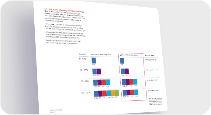 4.02 Color Palette: Advertising Color Migration Strategy The full color palette of 14 colors may be used only in markets where aided consumer awareness of the GE brand is 85-100%. Refer to the color matrix to determine the colors you may use, based on the degree of aided consumer awareness in your market. For example, if you have 70-84% consumer awareness in your market, you are able to use four of the 14 colors, Pantone 7455, Pantone 260, Pantone 485 and Process Cyan. All consumer awareness data must be reviewed by the Corporate brand team. The brand team will work with each market to establish the relevant tiers per country. Note Black may be used in all markets for one color applications, e.g., newspaper advertisements. Awareness Approved B2C Advertising Colors Approved B2B Advertising Colors Approved Tagline 0 – 45% “GE imagination at work” 7455 7455 46 – 69% “GE imagination at work” 7455 260 7455 260 70 – 84% “imagination at work” 7455 260 485 Cyan 7455 260 485 Cyan 85 – 100% “imagination at work” 7455 260 485 Cyan 144 376 7455 260 485 Cyan Note The tagline lock-up always appears in one color, i.e., the Monogram and tagline text are the same color. Never use the B2B Print Advertising tagline without the Monogram. Version 1.0