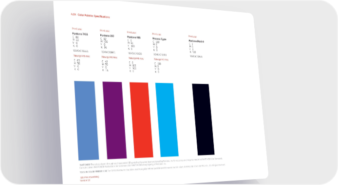 4.04 Color Palette: Specifications Print use: Print use: Print use: Print use: Print use: Pantone 7455 Pantone 260 Pantone 485 Process Cyan Pantone Black 6 C 80 C 52 C 0 C 100 C 0 M 53 M 100 M 95 M 0 M 0 Y 0 Y 0 Y 100 Y 0 Y 0 K 0 K 26 K 0 K 0 K 100 TOYO CF0444 TOYO CF0971 TOYO CF0100 TOYO CF0383 TOYO CF0946 Newsprint mix: Newsprint mix: Newsprint mix: Newsprint mix: C 65 C 42 C 0 C 100 M 30 M 70 M 100 M 0 Y 0 Y 0 Y 100 Y 0 K 0 K 15 K 0 K 0 PANTONE® The colors shown throughout these and all GE guidelines have not been evaluated by Pantone, Inc. for accuracy and may not match the PANTONE® Color Standards. Consult current PANTONE® Publications for accurate color. PANTONE® is the property of Pantone, Inc. TOYO 94 COLOR FINDER 1050 The TOYO references should be used as a guide. Where possible use Pantone to match colors. ® 1998,2002 TOYO INK MFG. CO., LTD. All rights reserved. B2B Print Advertising Version 1.0