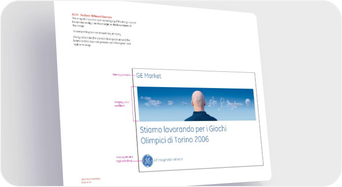12.04 Outdoor: Billboard Example You may also use non-cut-out imagery if the image cannot be cut-out easily. Use the margin as the boundaries of the iamge. Do not use key line art around any imagery. Always maintain the correct clear space around the brand architecture components and Monogram and tagline lock-up. Primary position GE Market Imagery does not bleed Stiamo lavorando per i Giochi Olimpici di Torino 2006 Monogram and tagline lock-up GE imagination at work B2B Print Advertising Version 1.0