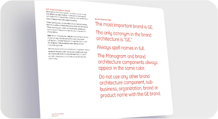 1.05 Brand Architecture: Review Our brand architecture organizes our businesses in a way that defines our key offerings, communicates the breadth Brand Architecture Rules and depth of GE to our primary audiences, and clarifies how these offerings meet their respective needs. The most important brand is GE. When creating new Solution Platform and Element names, limit the number and keep the names short and descriptive. When creating new names, ask individuals outside your own business if they understand the new name and the The only acronym in the brand offer it defines. Note Of our 11 businesses, only ten may use the GE brand. architecture is “GE.” Do not use any other brand architecture component, sub-business, organization, brand or product name with the GE brand. (Rare exceptions exist and must have Corporate approval.) Always spell names in full. The Monogram and brand architecture components always appear in the same color. Our goal is to build a stronger visual and verbal relationship between the Monogram The Monogram and brand and all of the products and services that GE offers the world today. architecture components always appear in the same color. Do not use any other brand architecture component, sub- business, organization, brand or product name with the GE brand. B2B Print Advertising Version 1.0