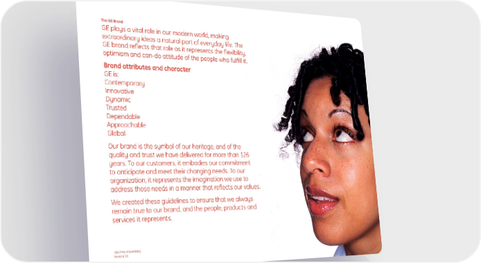 The GE Brand GE plays a vital role in our modern world, making extraordinary ideas a natural part of everyday life. The GE brand reflects that role as it represents the flexibility, optimism and can-do attitude of the people who fulfill it. Brand attributes and character GE is: Contemporary Innovative Dynamic Trusted Dependable Approachable Global Our brand is the symbol of our heritage, and of the quality and trust we have delivered for more than 126 years. To our customers, it embodies our commitment to anticipate and meet their changing needs. To our organization, it represents the imagination we use to address those needs in a manner that reflects our values. We created these guidelines to ensure that we always remain true to our brand, and the people, products and services it represents. B2B Print Advertising Version 1.0