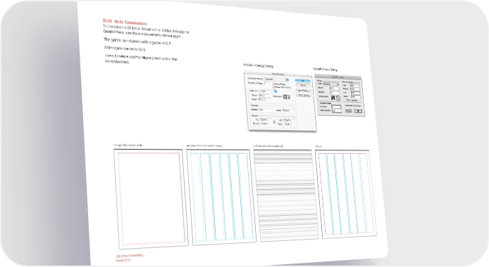13.03 Grids: Construction To construct a US letter document in Adobe Indesign or QuarkXPress, use the measurements shown right. This grid is six columns with a gutter of 0.2". All margins are set to 0.45" Use a baseline grid for aligning text within the Adobe InDesign Setup QuarkXPress Setup advertisement. Image/ Clear Space Guide Text Area / Six Columns with Gutters 0.2"/5mm Optional Baseline Grid Full Grid B2B Print Advertising Version 1.0