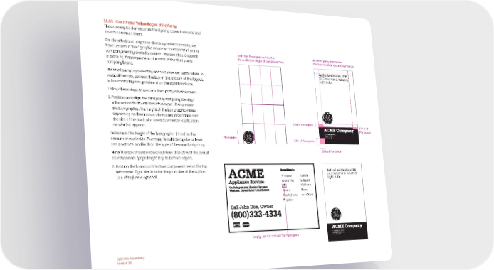 11.05 Classifieds/ Yellow Pages: third Party These examples demonstrate third party advertisements and how to construct them. For classified and telephone directory advertisements, we have created a “box” graphic device to “contain” third party Scale the Monogram to fit within Add third party information. company identity and information. This box should appear the width and height of one grid section. Maintain the clear space shown below. in black or, if appropriate, in the color of the third party company brand. Authorized Dealer of GE The third party logo/identity and text reverses out to white. In GE Consumer & Industrial Light Bulbs vertical formats, position the box at the bottom of the layout. In horizontal layouts, position it on the right hand side. Follow these steps to create a third party advertisement: 1. Position and align the third party company identity/ information flush with the left margin. Then position the box graphic. The height of the box graphic varies, depending on the amount of required information and the size of the particular advertisement or application 25% of Monogram on which it appears. 12.5% of Monogram 555 Broadway, Suite 5 Determine the height of the box graphic based on the City Name, State 12345 Monogram 555-555-1234 amount of text inside. Text copy should always be at least 50% of Monogram one point size smaller than the type of the main body copy. Note The box should not exceed more than 25% of the overall 50% of Monogram advertisement /page height (top to bottom edges). 2. Position the brand architecture component text in the top left corner. Type size is twice the point size of the tagline. Authorized Dealer of GE Use of tagline is optional. Whirlpool Admiral GE Consumer & Industrial Light Bulbs Kitchen Aid Sub Zero GE Kelvinator Amana Sears Westinghouse and Others Frigidaire 555 Broadway, Suite 5 Simply use “GE” and not the Monogram City Name, State 12345 555-555-1234 B2B Print Advertising Version 1.0