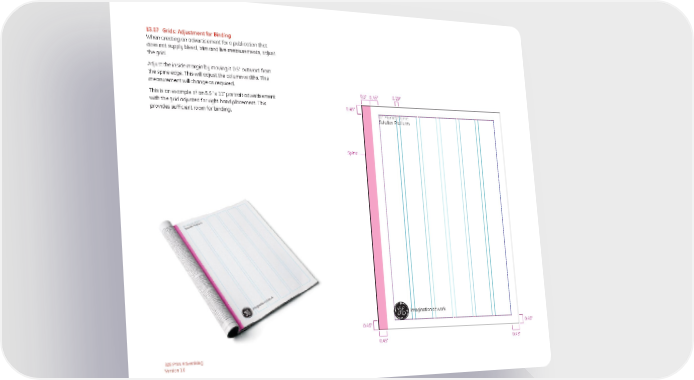 13.07 Grids: Adjustment for Binding When creating an advertisement for a publication that does not supply bleed, trim and live measurements, adjust the grid. Adjust the inside margin by moving it 0.5" outward from the spine edge. This will adjust the column widths. This measurement will change as required. 0.5" 0.45" 0.19" This is an example of an 8.5" x 11" portrait advertisement with the grid adjusted for right hand placement. This 0.45" provides sufficient room for binding. GE Market Name Solution Platform Spine imagination at work 0.45" 0.45" 0.45" 0.45" B2B Print Advertising Version 1.0