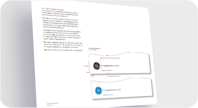 3.04 Tagline: Tagline Translation You may translate the tagline into the local language if it is legally required. Obtain the correct translations from the brand team at [email protected]. The tagline must always appear in English. However, you may also include a translation of the tagline in your local language. If it is legally required, or if it will enhance the communication, or if it is preferable in the local business culture to use the local language, In this situation, the Monogram and tagline lock-up appears in English in the correct size and position. Align the first letter of the tagline translation line flush left with the “G” in “GE.” Align the baseline of the tagline translation line with the bottom margin of the page layout. The tagline translation is always set in GE Inspira in the same color as the English version. This example shows the type size for a tagline translation for a US size (8.5 x 11”) format. Translated tagline placement Note Don’t use the Monogram with the tagline translation line. A4 – shown at 80% Align translation flush left with the tagline 21.75mm GE imagination at work L’imagination en action 8mm 11mm GE Inspira Regular, 10pt GE imagination at work L’imagination en action B2B Print Advertising Version 1.0
