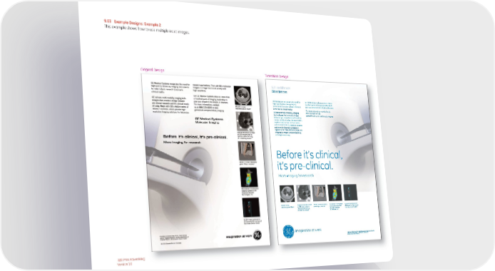 9.03 Example Designs: Example 2 This example shows how to use multiple inset images. Original Design Transition Design GE Healthcare Biosciences GE Healthcare recognizes the need for Let GE Healthcare draw on more than a high-quality laboratory imaging hundred years of imaging leadership to instruments to make today’s research give your research the results it deserves. tomorrow’s clinical reality. For more information, contact us at GE delivers multi-modality imaging 888.725.8285 or visit technologies that provide a bridge gehealthcare.com/preclinical_imaging between pre-clinical research and the clinical needs of today. Begin with GE’s explore series of microCT scanners, which provide high resolution imaging solutions for laboratory research applications. Then add GE's molecular imagers to image functional activity with high sensitivity. Before it’s clinical, it’s pre-clinical. Micro imaging for research MicroCT: in vivo, Vascular structures as small MicroCT: in vivo, respiratory MicroOptical: Fluorescence Cu-64 image produced on respiratory gated, 90µm* as 200 microns may be gated, 90µm, rendered* imaging courtesy of ART GE Discovery LS courtesy of resolved within the lung Advanced Research Fox Chase Cancer Center of a breathing mouse.* Technologies, Inc. imagination at work *Courtesy of Dianna Cody, Ph.D., Small Animal Cancer Imaging Research Facility, Department of Imaging Physics, MD Anderson Cancer Center. © 2003 General Electric Company B2B Print Advertising Version 1.0