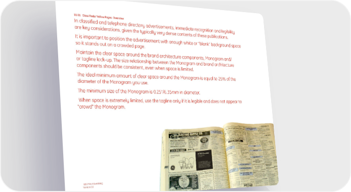 11.01 Classifieds/ Yellow Pages: Overview In classified and telephone directory advertisements, immediate recognition and legibility are key considerations, given the typically very dense contents of these publications. It is important to position the advertisement with enough white or “blank” background space so it stands out on a crowded page. Maintain the clear space around the brand architecture components, Monogram and/ or tagline lock-up. The size relationship between the Monogram and brand architecture components should be consistent, even when space is limited. The ideal minimum amount of clear space around the Monogram is equal to 25% of the diameter of the Monogram you use. The minimum size of the Monogram is 0.25"/6.35mm in diameter. When space is extremely limited, use the tagline only if it is legible and does not appear to “crowd” the Monogram. B2B Print Advertising Version 1.0