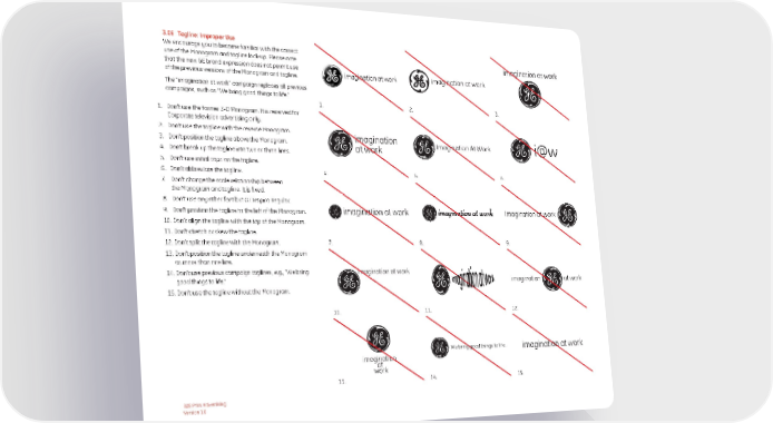 3.06 Tagline: Improper Use We encourage you to become familiar with the correct use of the Monogram and tagline lock-up. Please note imagination at work that the new GE brand expression does not permit use imagination at work of the previous versions of the Monogram and tagline. imagination at work The “imagination at work” campaign replaces all previous campaigns, such as “We bring good things to life.” 1. 2. 3. 1. Don’t use the former 3-D Monogram. It is reserved for Corporate television advertising only. 2. Don’t use the tagline with the reverse Monogram. imagination 3. Don’t position the tagline above the Monogram. at work Imagination At Work i@w 4. Don’t break up the tagline into two or three lines. 5. Don’t use initial caps on the tagline. 6. Don’t abbreviate the tagline. 4. 5. 6. 7. Don’t change the scale relationship between the Monogram and tagline. It is fixed. 8. Don’t use any other font but GE Inspira Regular. 9. Don’t position the tagline to the left of the Monogram. imagination at work imagination at work 10. Don’t align the tagline with the top of the Monogram. 11. Don’t stretch or skew the tagline. 12. Don’t split the tagline with the Monogram. 7. 8. 9. 13. Don’t position the tagline underneath the Monogram as more than one line. 14. Don’t use previous campaign taglines, e.g., “We bring imagination at work good things to life.” imagination at work 15. Don’t use the tagline without the Monogram. 10. 11. 12. We bring good things to life. imagination at work imagination at work 13. 14. 15. B2B Print Advertising Version 1.0