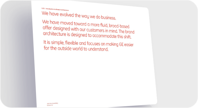 1.01 Introduction to Brand Architecture We have evolved the way we do business. We have moved toward a more fluid, broad-based offer designed with our customers in mind. The brand architecture is designed to accommodate this shift. It is simple, flexible and focuses on making GE easier for the outside world to understand. B2B Print Advertising Version 1.0
