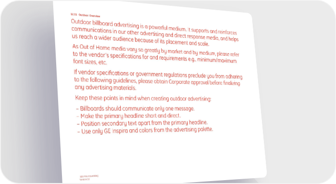 12.01 Outdoor: Overview Outdoor billboard advertising is a powerful medium. It supports and reinforces communications in our other advertising and direct response media, and helps us reach a wider audience because of its placement and scale. As Out of Home media vary so greatly by market and by medium, please refer to the vendor’s specifications for and requirements e.g., minimum/maximum font sizes, etc. If vendor specifications or government regulations preclude you from adhering to the following guidelines, please obtain Corporate approval before finalizing any advertising materials. Keep these points in mind when creating outdoor advertising: – Billboards should communicate only one message. – Make the primary headline short and direct. – Position secondary text apart from the primary headline. – Use only GE Inspira and colors from the advertising palette. B2B Print Advertising Version 1.0